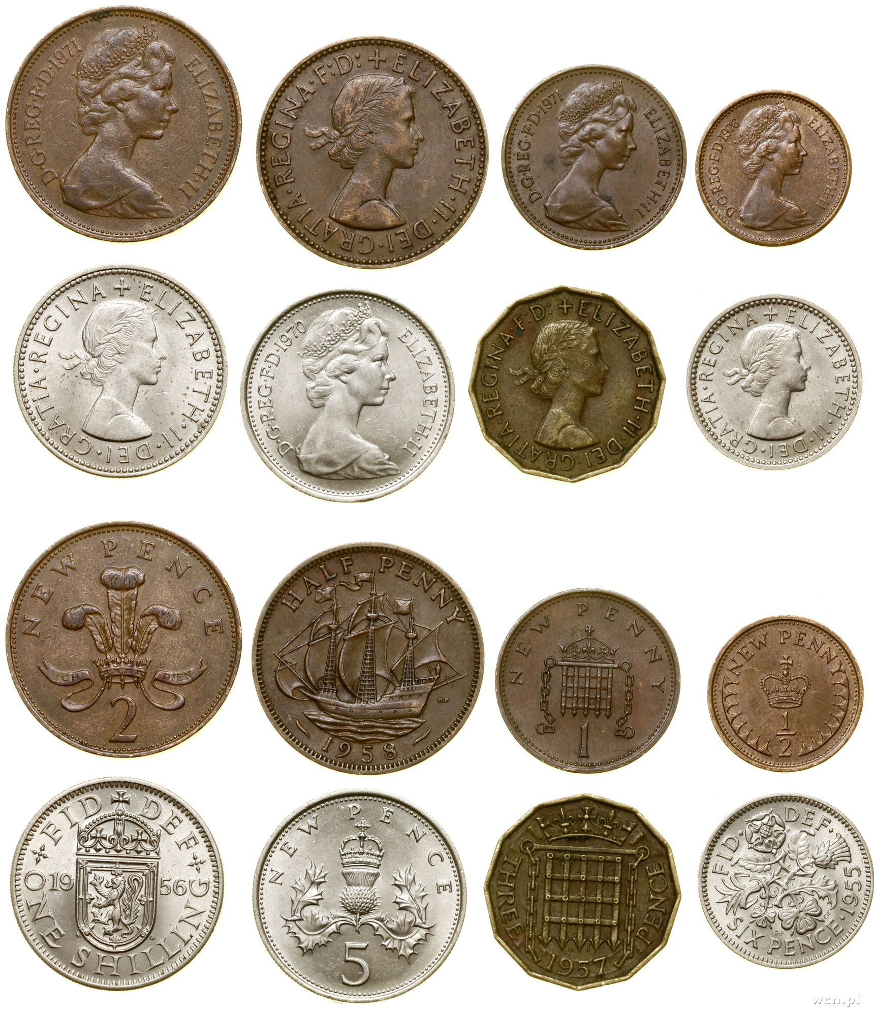 | Opis: | Wielka Brytania, Elżbieta II (1952–2022), zestaw 14 monet, 6 pensów 1955, szyling 1956, 3 pensy 1957, 1/2 korony 1958, 1/2 pensa 1958, 1 pens 1963, korona (5 szylingów) 1965, 2 szylingi 1966, 50 pensów 1969, 5 pensów 1970, 2 pensy 1971, 1 pens 1971, 10 pensów 1976, 1/2 pensa 1976, razem 14 sztuk |