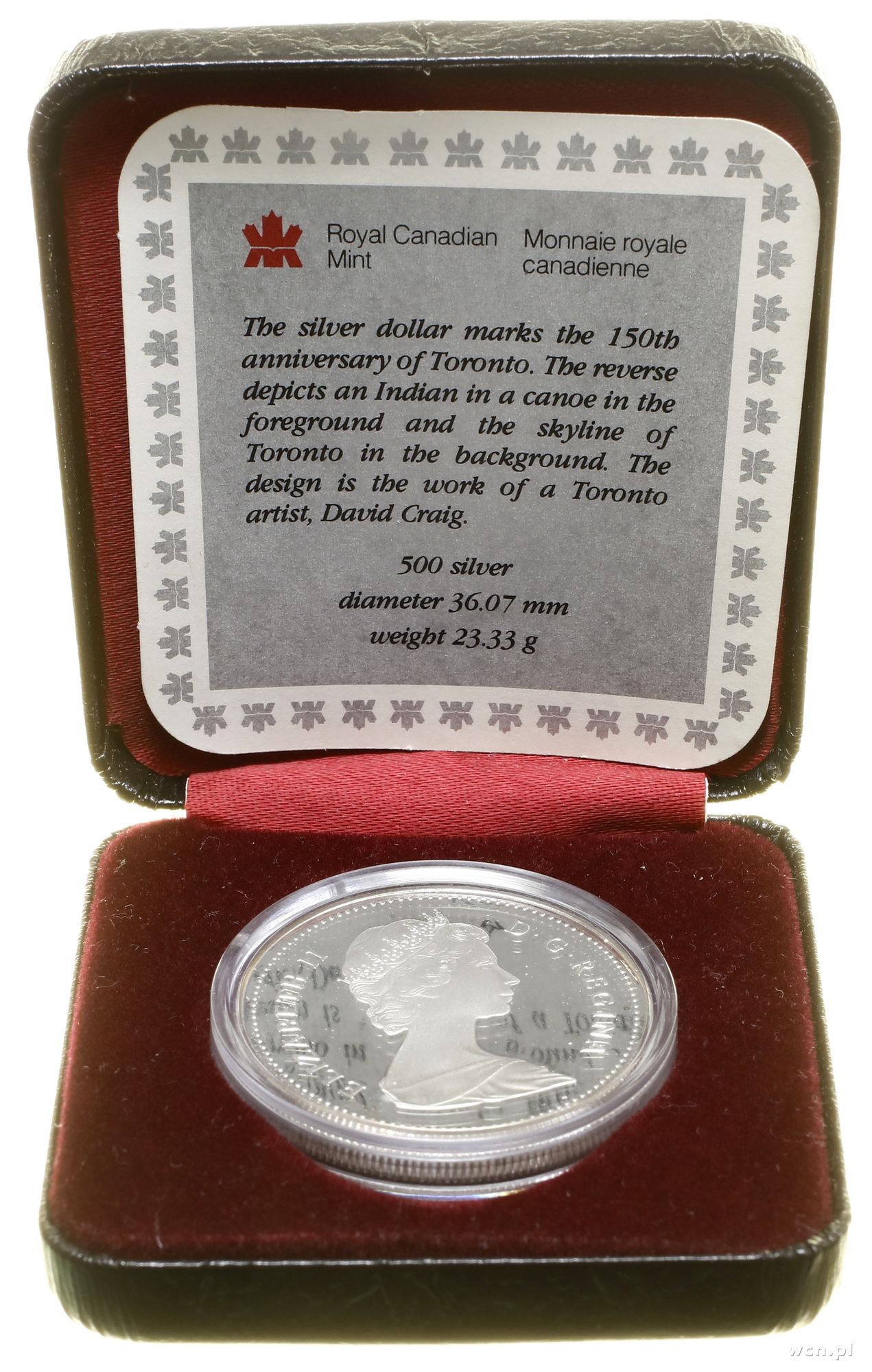 | Opis: | Kanada, Elżbieta II (1952–2022), 1 dolar 1984, Ottawa, 150-lecie Toronto, srebro próby 500, 23.3 g, stemple lustrzane, moneta w plastikowym kapslu i oryginalnym pudełku z certyfikatem, mikroryski na rewersie, KM 140 |