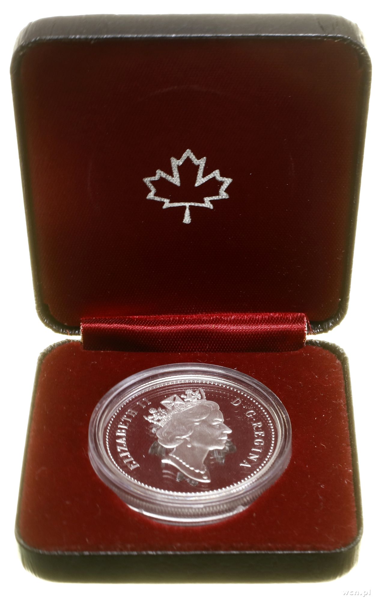 Opis: Kanada, Elżbieta II (1952–2022), 1 dolar 1992, Ottawa, 175 lat dyliżansów między Kingston i Yorkiem, srebro próby 500, 23.3 g, stemple lustrzane, moneta w plastikowym kapslu i oryginalnym pudełku, KM 210
