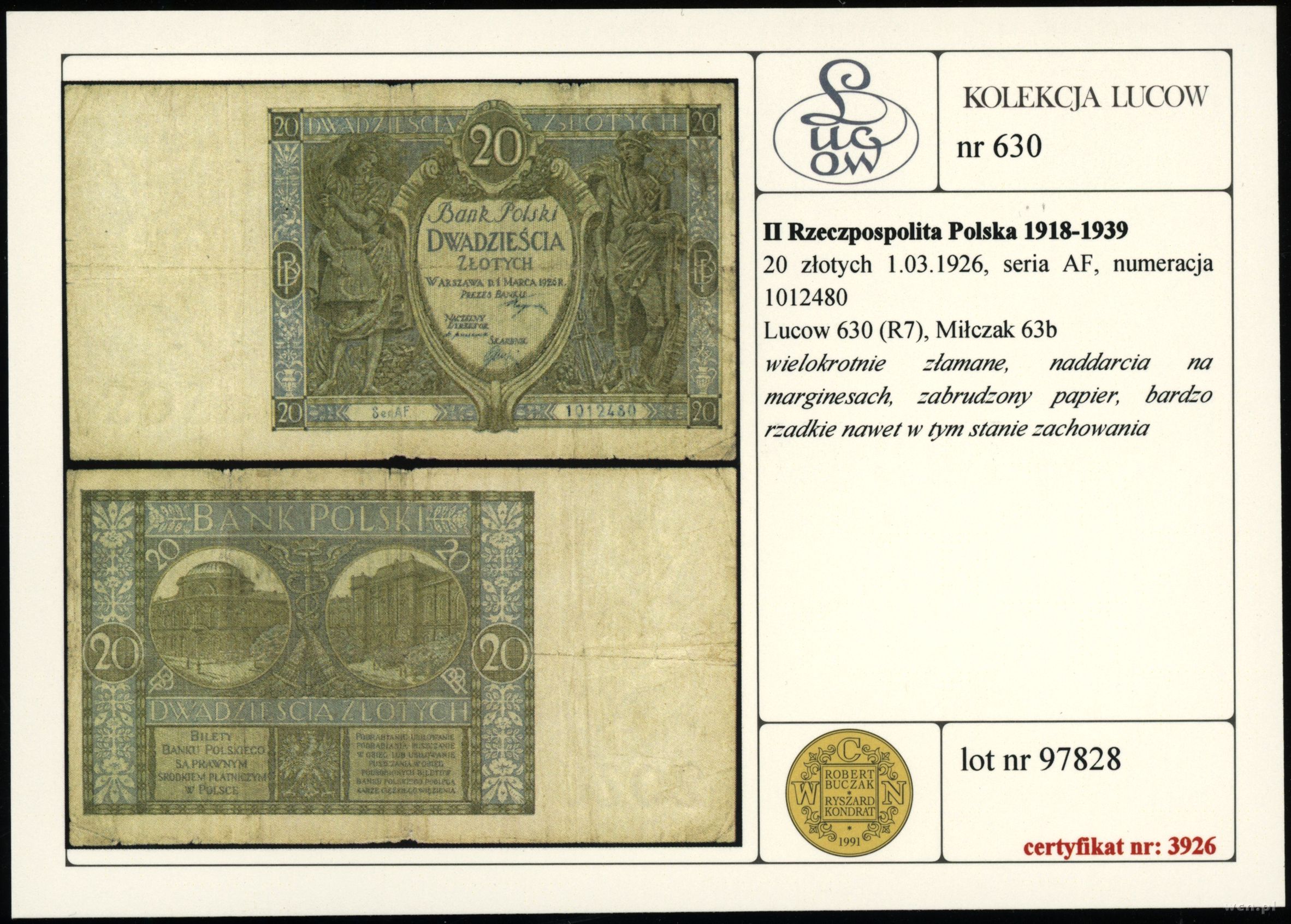 Opis: | Polska, II Rzeczpospolita Polska (1918–1939) - emisje po reformie Władysława Grabskiego, 20 złotych 1.03.1926, seria AF, numeracja 1012480, wielokrotnie złamane, naddarcia na marginesach, zabrudzony papier, bardzo rzadkie nawet w tym stanie zachowania, banknot z kolekcji Lucow, Lucow 630 (R7), Miłczak 63b |