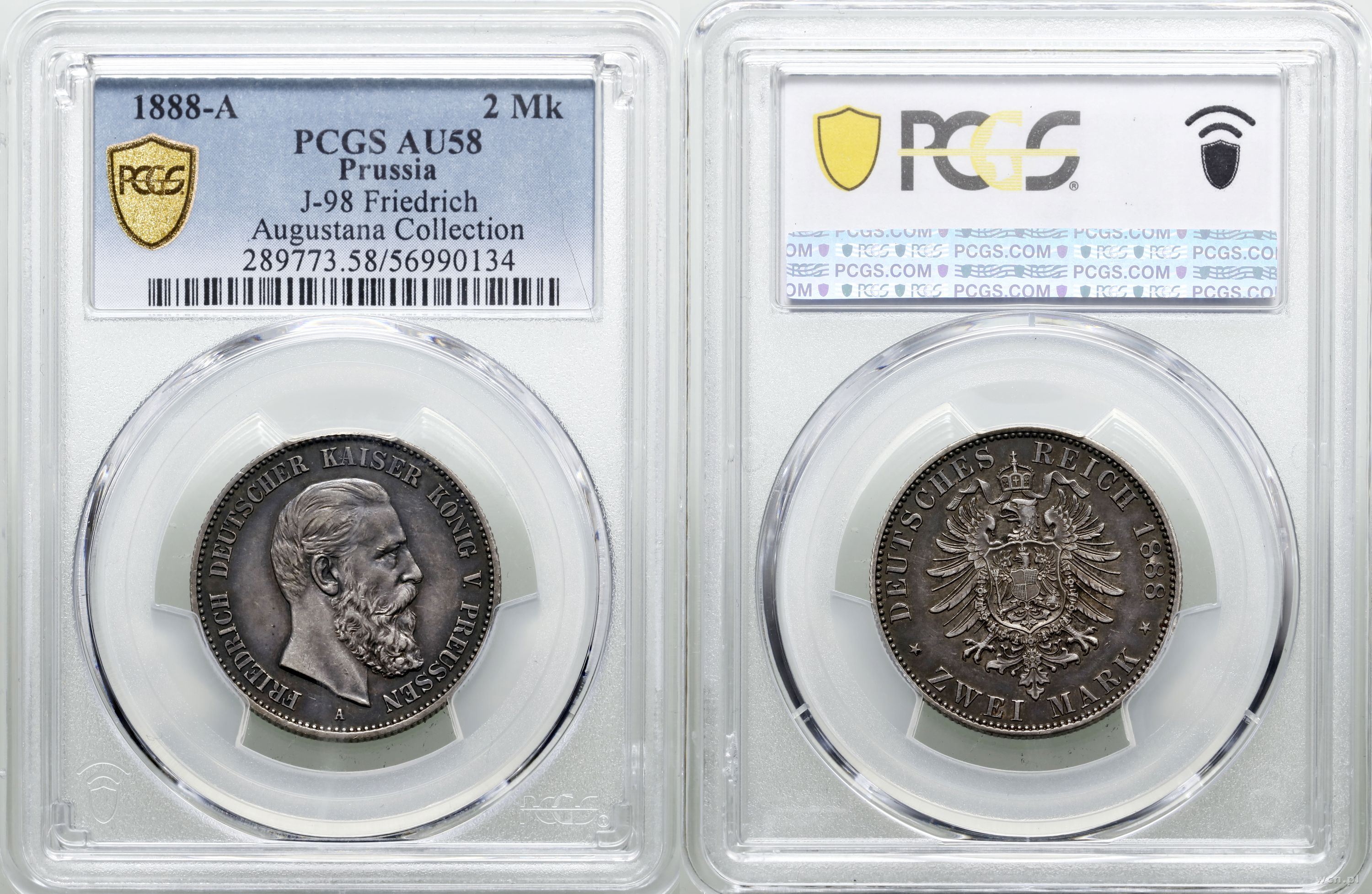 Opis: | Niemcy, Prusy – królestwo (1701–1918) - Fryderyk III (1888), 2 marki 1888, Berlin, bardzo ładne z blaskiem menniczym pod patyną , w opakowaniu firmy PCGS nr 289773.58/56990134 z oceną AU58, AKS 122, Jaeger 98 |