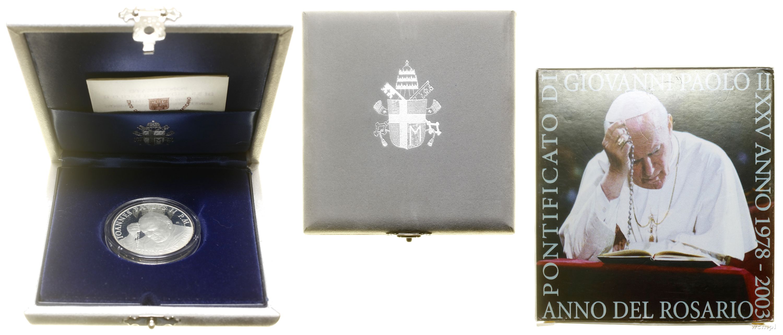 Opis: | Watykan (Państwo Kościelne), Jan Paweł II (1978–2005), 5 euro 2003, Rzym, Rok Różańca, srebro próby 925, ok. 18 g, stemple lustrzane, nakład 10.000 sztuk, moneta w plastikowym kapslu i oryginalnym pudełku z certyfikatem, delikatna patyna, KM 354 |
