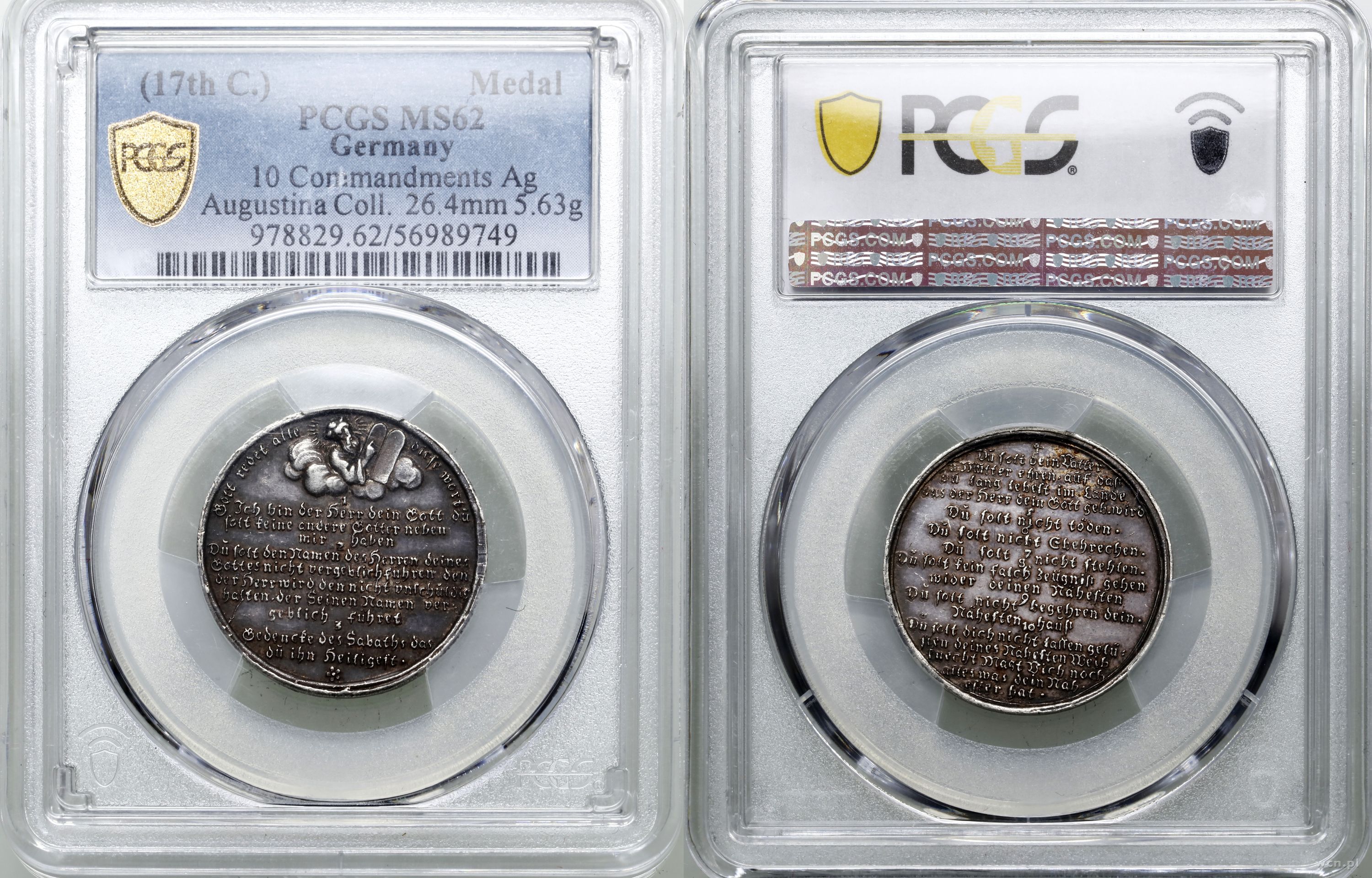 Opis: | Niemcy, Saksonia - Fryderyk August III (1904–1918), medal z dekalogiem XVII w., Aw: Mojżesz wśród chmur trzymający tablice z X przykazaniami, poniżej treść przykazań; Rw: Poziomo dalsza część przykazań, srebro, stara patyna, bardzo ładnie zachowany medal, jedyny egzemplarz oceniony w PCGS , w opakowaniu firmy PCGS nr 978829.62/56989749 z oceną MS62 |