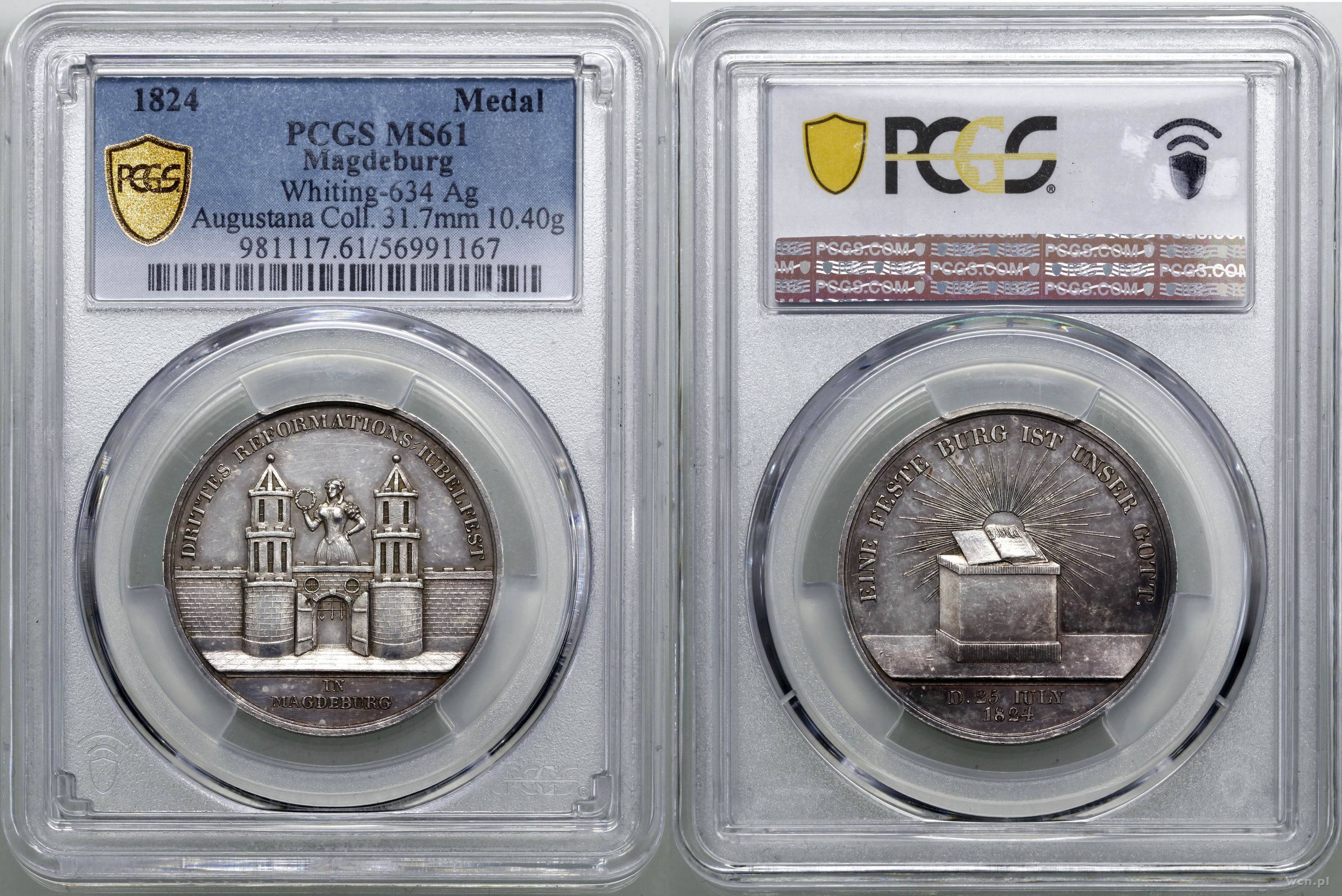 Opis: Niemcy, Magdeburg, Obchody 300. rocznicy Reformacji w Magdeburgu 1824, Aw: Matka Boska nad bramą, DRITTES REFORMATIONS IUBELFEST, u dołu IN MAGDEBURG; Rw: Księga na ołtarzu, EINE FESTE BURG IST UNSER GOTT, u dołu D 25 JULY 1824, minimalnie przetarty medal, subtelna patyna, pięknie zachowany, z kolekcji Augustiana , w opakowaniu firmy PCGS nr 981117.61/56991167 z oceną MS61, Whiting 634