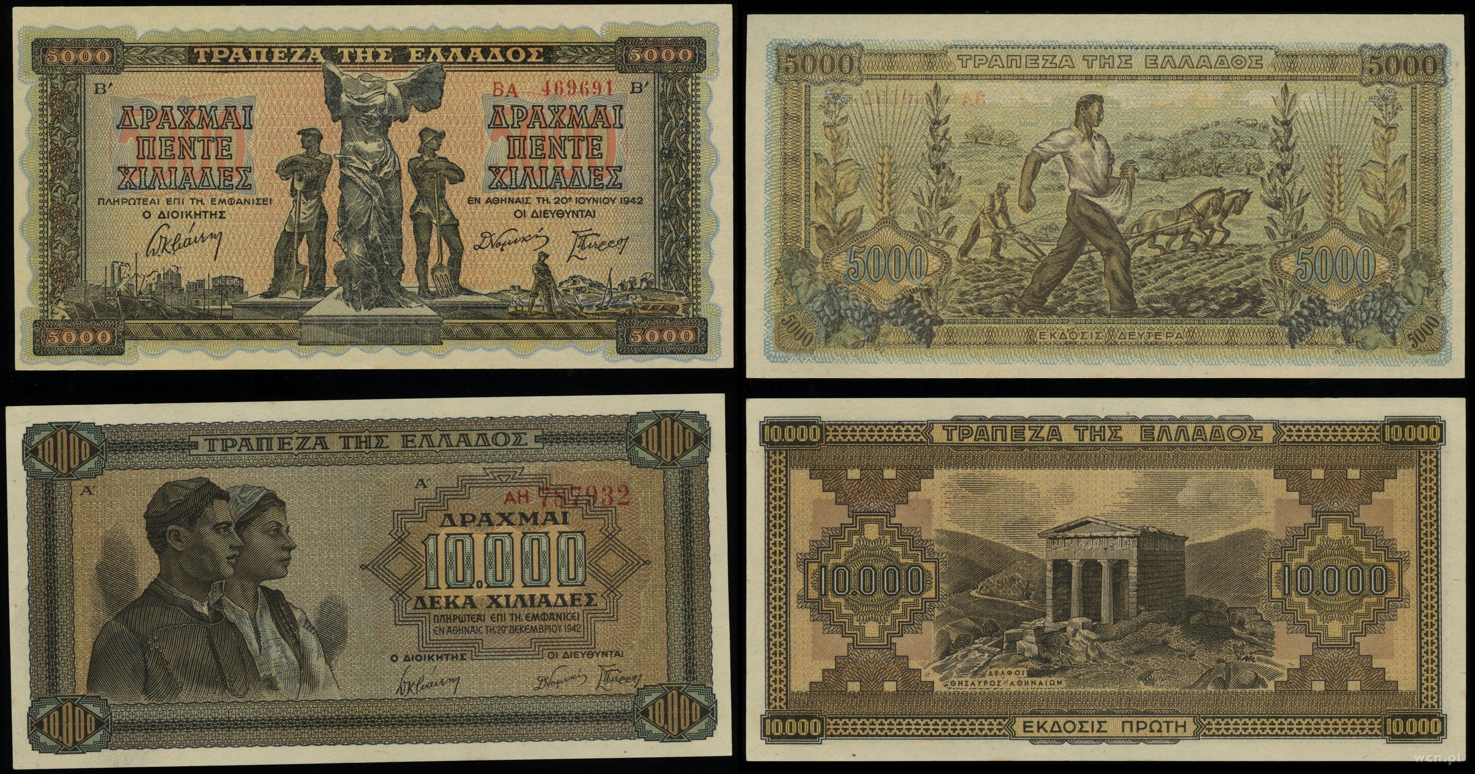 | Opis: | Grecja, Τραπεζα τηε Ελλαδοσ / Bank of Greece, zestaw 4 banknotów 1942–1943, 1) 1.000 drachm, 21.08.1942 2) 10.000 drachm, 29.12.1942 3) 5.000 drachm, 20.06.1942 4) 5.000 drachm, 19.07.1943, razem 4 sztuki, Pick 118–122 |