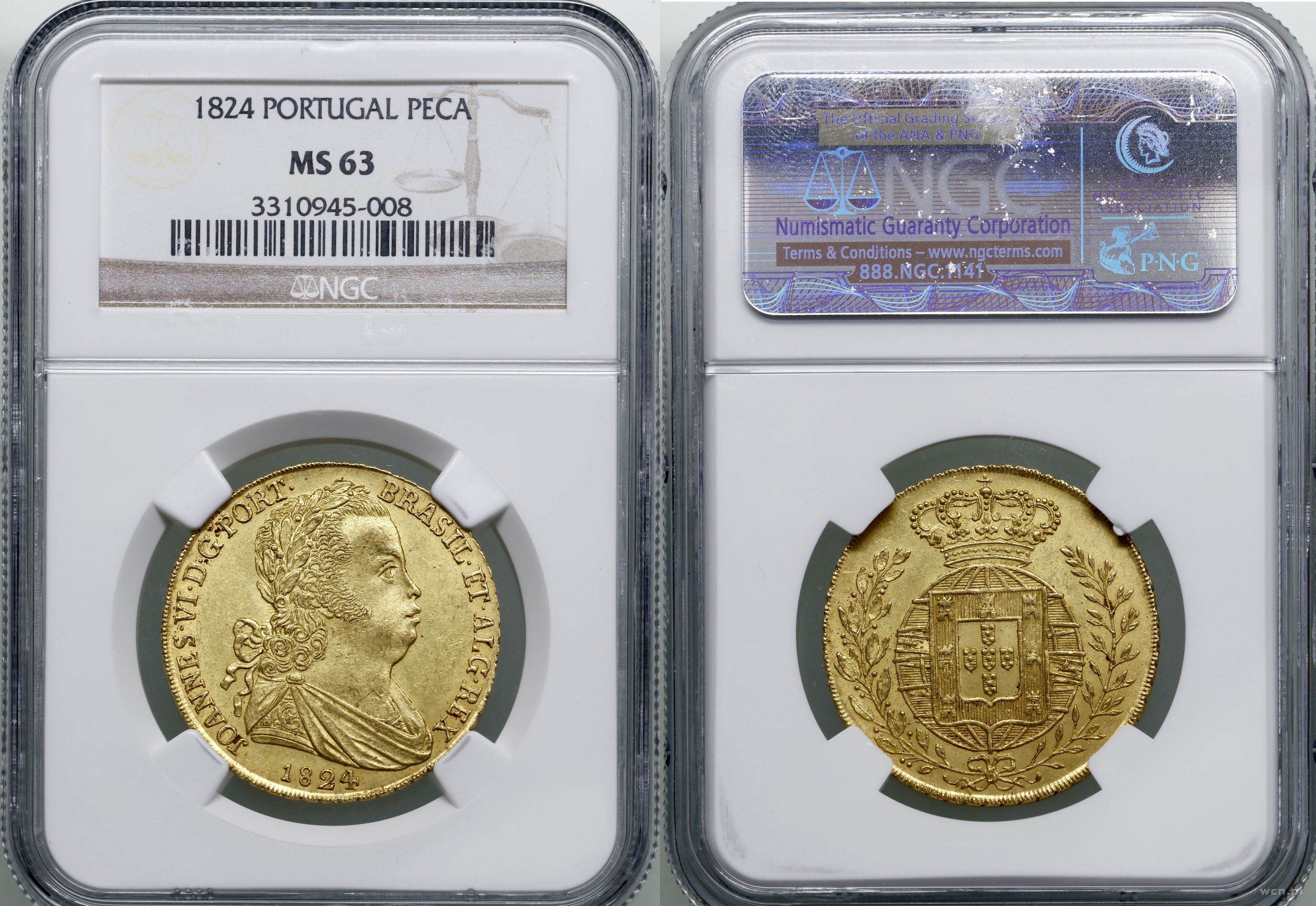 | Opis: | Portugalia, Jan VI (1816–1826), 4 escudo (peça) 1824, Lizbona, złoto próby 917, waga katalogowa 14.34 g, nakład tylko 1.553 sztuk, piękny egzemplarz , w opakowaniu firmy NGC nr 3310945-008 z oceną MS63, Fr. 128, KM 364 |