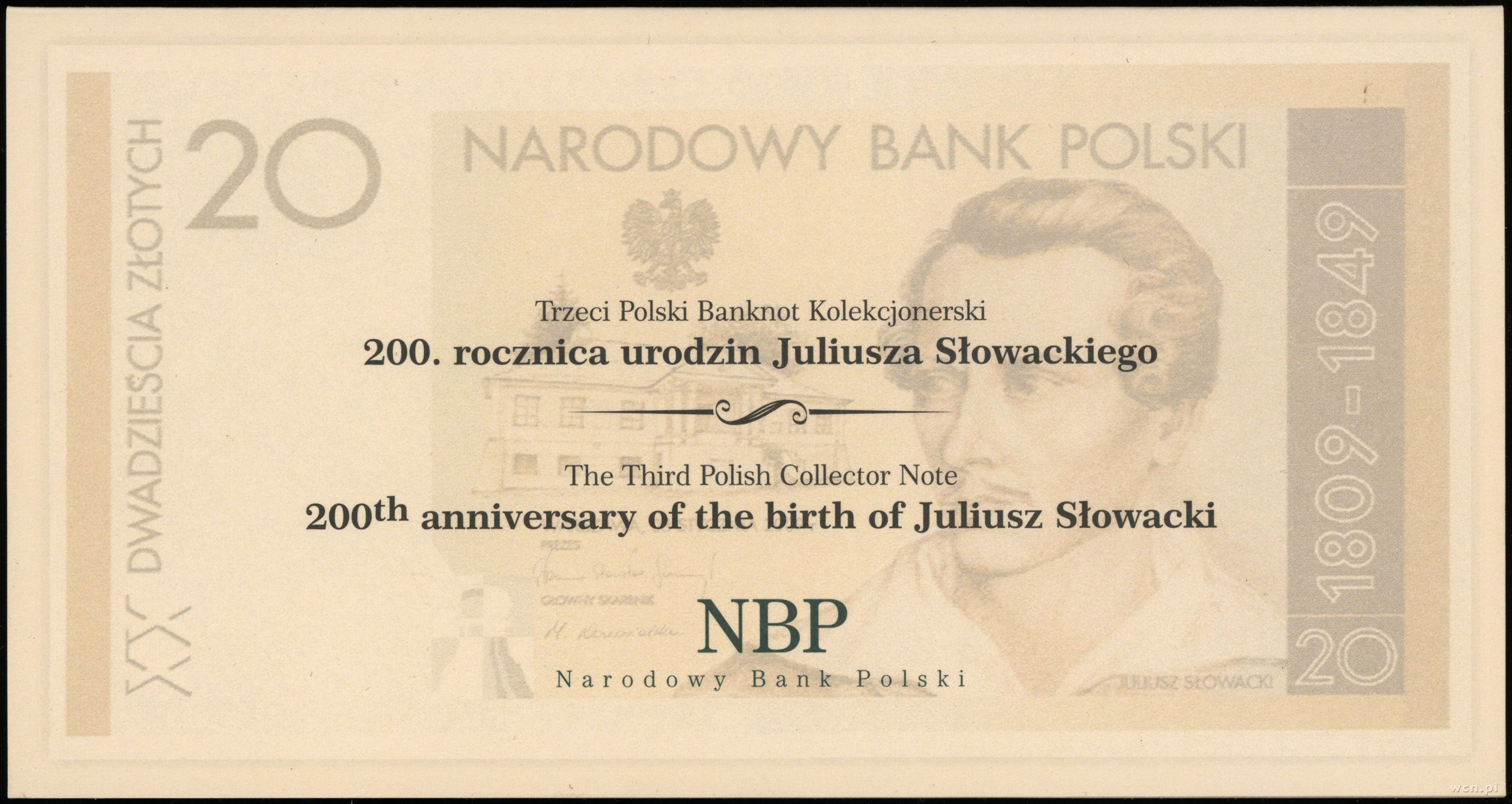 | Opis: | Polska, III Rzeczpospolita Polska (od 1989), 20 złotych 8.01.2009, Juliusz Słowacki - 200. rocznica urodzin, seria JS 0000000, czerwone ukośne “WZÓR” / “SPECIMEN”, dodatkowa numeracja wzoru 0912, wyśmienity banknot, dodatkowo dołączone kartonowe etui NBP , w opakowaniu firmy PMG nr 1918830-006 z oceną 67 Super Gem UNC EPQ, Lucow 1691, Miłczak KL3Wa |