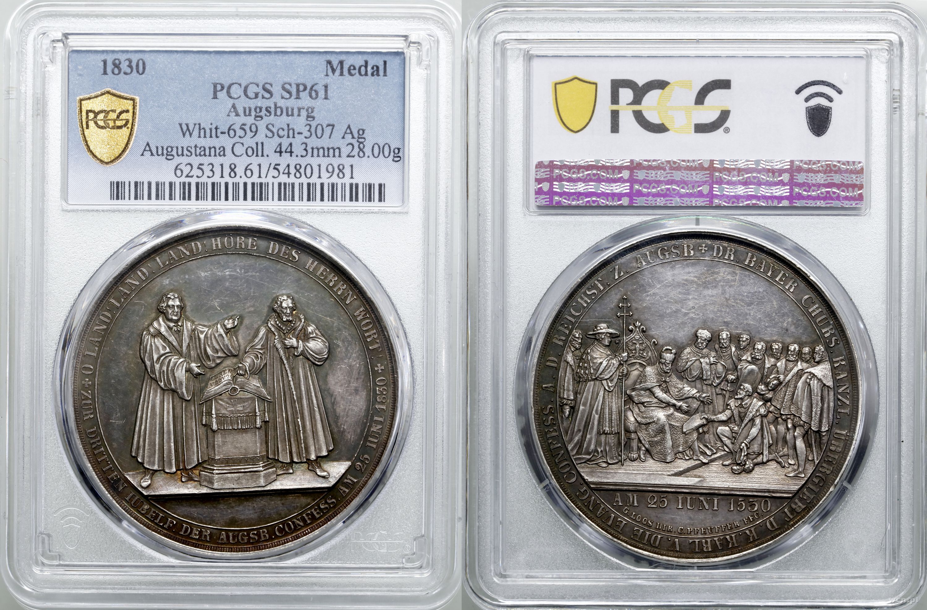 | Opis: | Niemcy, Augsburg, medal 1830 , na 300. lecie Konfesji Augsburskiej, sygnowany G. Loos/C. Pfeuffer; Aw: Marcin Luter i Filip Melanchton stojący obok ołtarza z otwartą biblią, legenda, Rw: Scena Sejmu Rzeszy, na której odczytano Konfesję Augsburską (księgę wyznaniową luteranizmu) poniżej sceny data AM 25 IUNI 1530 (25 czerwca 1530r.), w otoku legenda, srebro, 28.00 g , w opakowaniu firmy PCGS nr 54801981 z oceną SP61, Slg. Whiting 659, Slg. Merseburger 2151 |