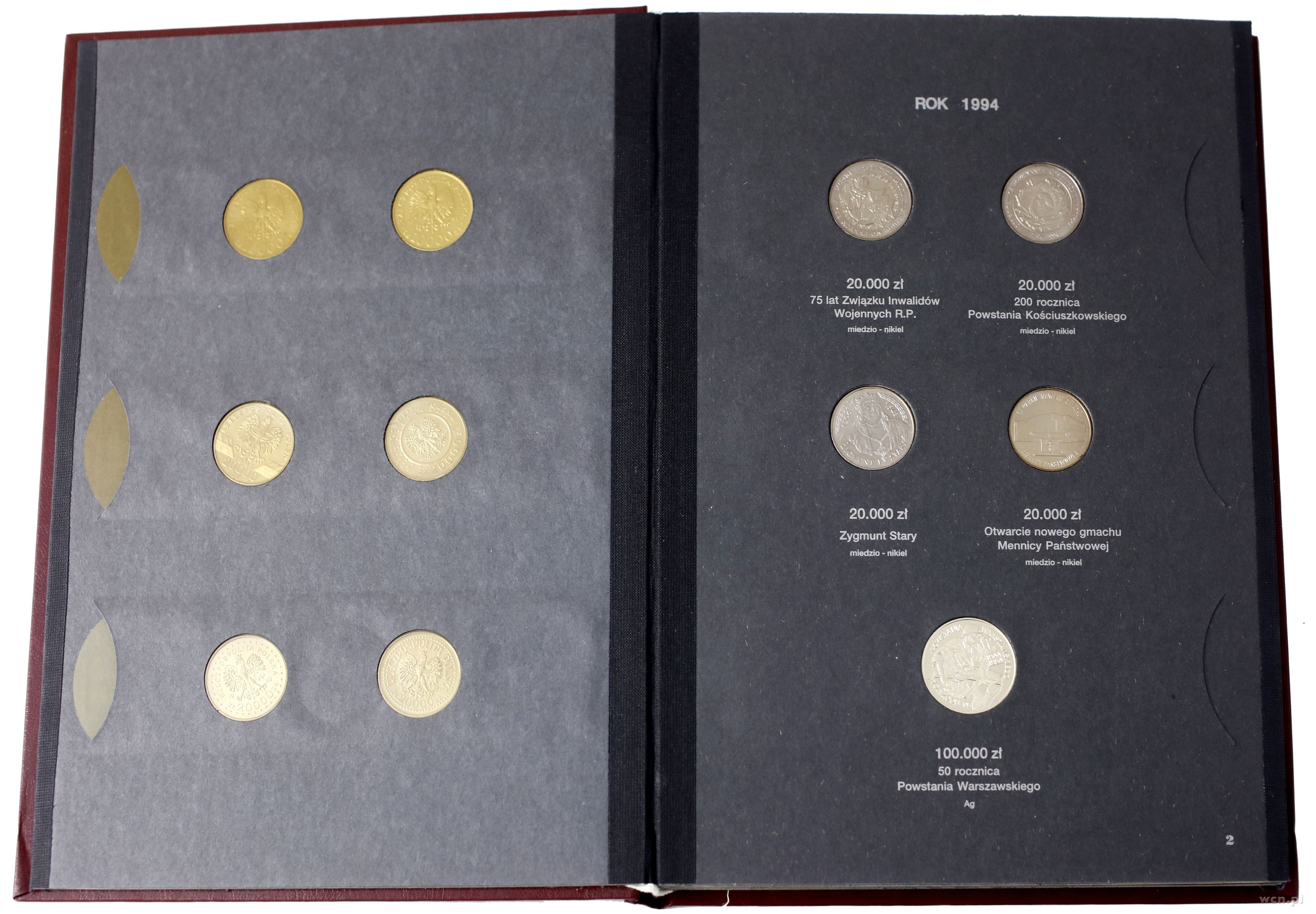 | Opis: | Polska, III Rzeczpospolita Polska (od 1989) - monety obiegowe, klaser z monetami polskimi z lat 1990–1995, Warszawa, nominały od 10.000 do 100.000 złotych i od 1 grosza do 5 złotych, wśród których zestawy monet obiegowych, miedzioniklowe dwuzłotówki, monety o nominale 20.000 złotych oraz srebrne 100.000 zł na pamiątkę 50. rocznicy Powstania Warszawskiego (brak 5 złotych z 1994), razem 48 monet w czerwonym klaserze wraz z etui, w większości w wyśmienitych stanach zachowania |
