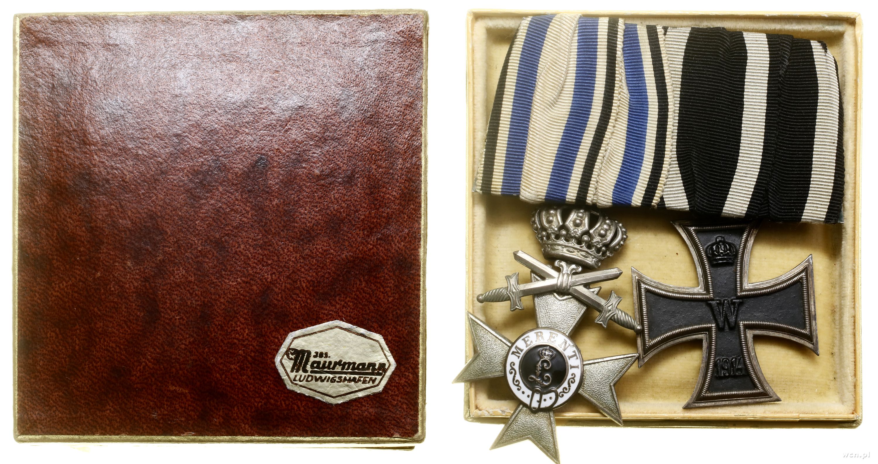 | Opis: | Niemcy, szpanga odznaczeń, w skład zestawu wchodzi: 1) Wojskowy Krzyż Zasługi III Klasy z Koroną i Mieczami (Militärverdienstkreuz 3. Klasse mit Krone und Schwerten), 2) Krzyż Żelazny II Klasy wz. 1914 (Eisernes Kreuz II Klasse), razem 2 sztuki, łącznik Krzyża Żelaznego wtórnie zlutowany, OEK 428, 1909 |