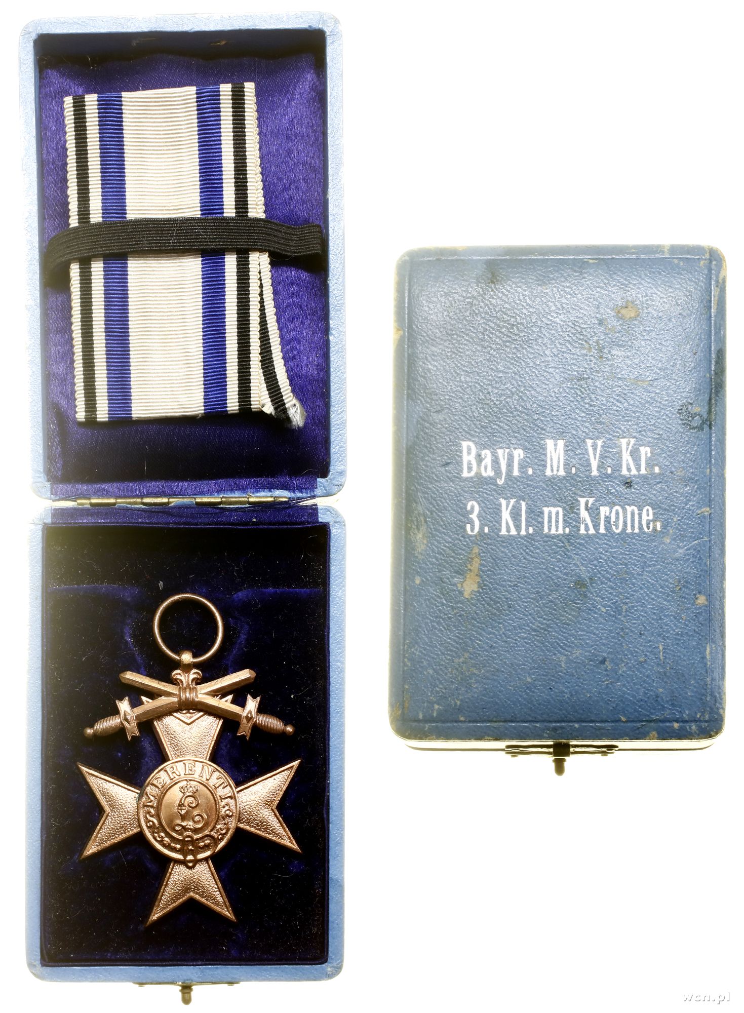 | Opis: | Niemcy, Bawaria - Ludwik III (1913–1918), Wojskowy Krzyż Zasługi III Klasy z Mieczami (Militärverdienstkreuz 3. Klasse mit Schwerten) 1913–1921, Krzyż maltański, w górnej części dwa skrzyżowane miecze, w medalionie monogram L otoczony pasem, na którym MERENTI, na stronie odwrotnej w medalionie Lew w lewo otoczony pasem, na którym 1866, odznaczenie czteroczęściowe, mocowane na wstążkę, miedź, 42.4 x 50.1 mm, 22.19 g (bez wstążki), dodatkowo oryginalne pudełko po Krzyżu z Koroną, Barac 211, OEK 432 |