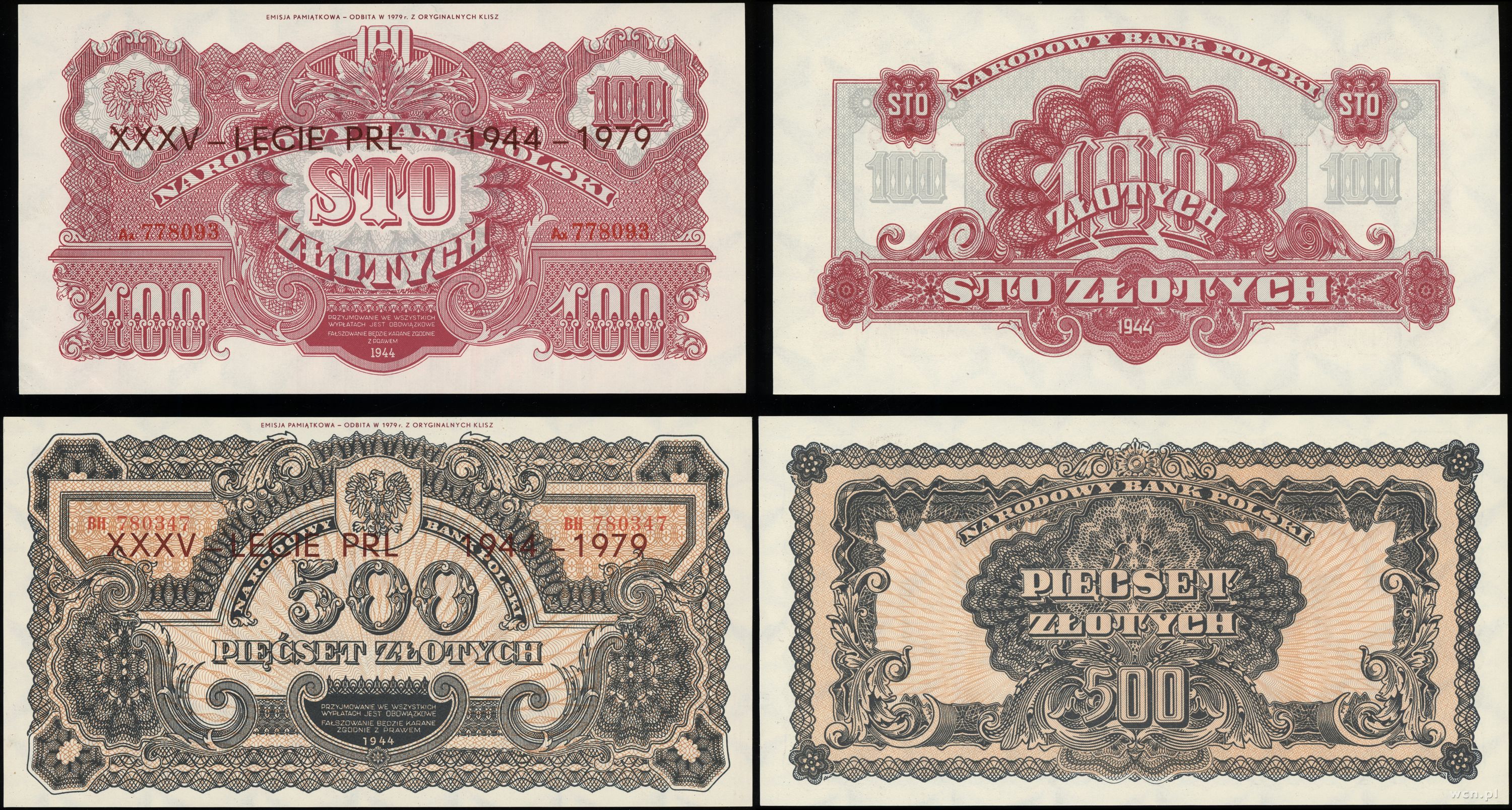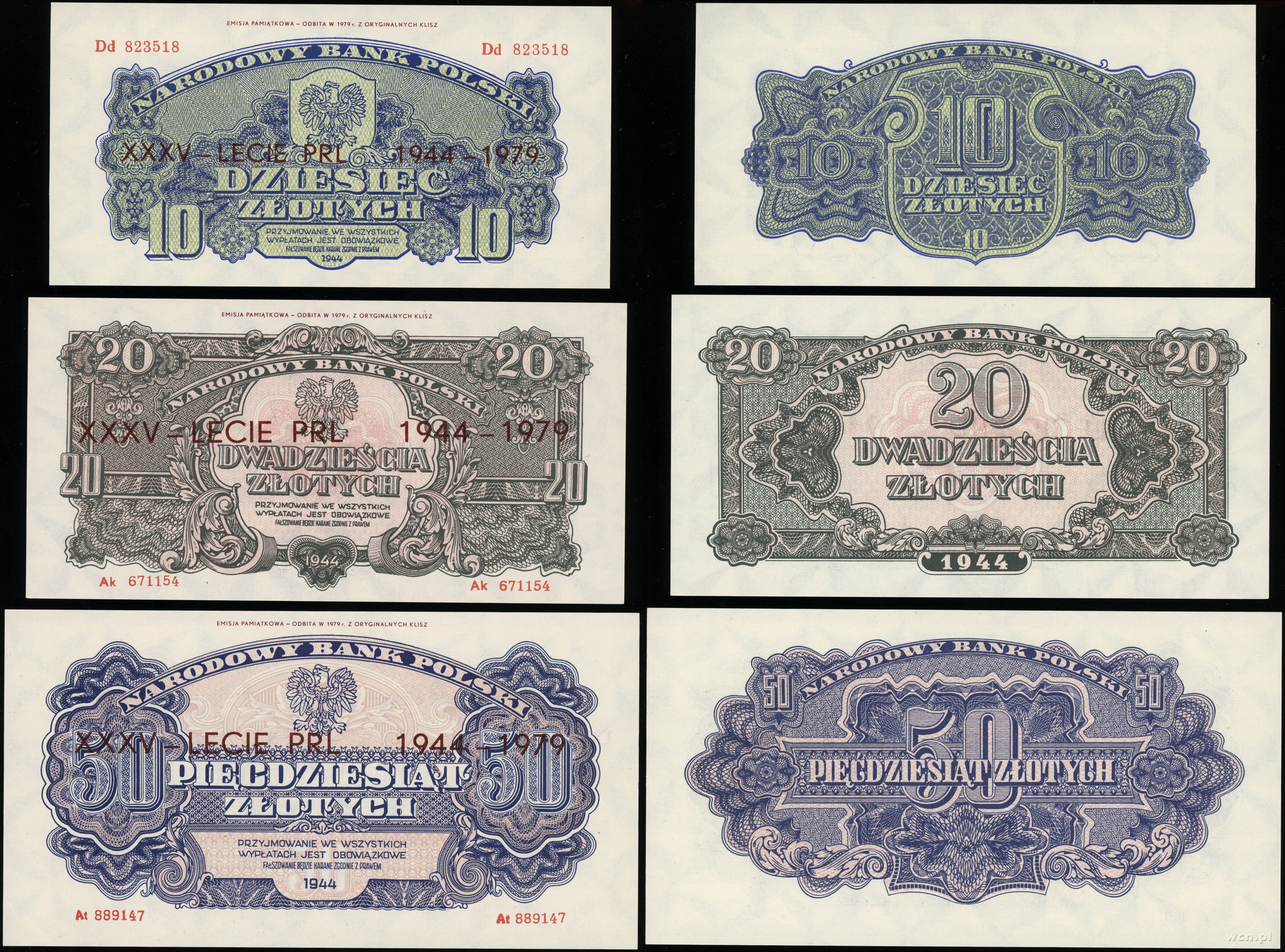Opis: Polska, Polska Rzeczpospolita Ludowa (1952–1989), komplet banknotów emisji pamiątkowej 1979, w skład zestawu wchodzą: 50 groszy, 1, 2, 5, 10, 20, 50, 100 i 500 złotych 1944, wszystkie z nadrukiem: EMISJA PAMIĄTKOWA - ODBITA W 1979 r Z ORYGINALNYCH KLISZ. Przez środek w poziomie nadruk XXXV - LECIE PRL 1944-1979, część banknotów ze złamanymi rogami, łącznie 9 sztuk, Miłczak 104–119