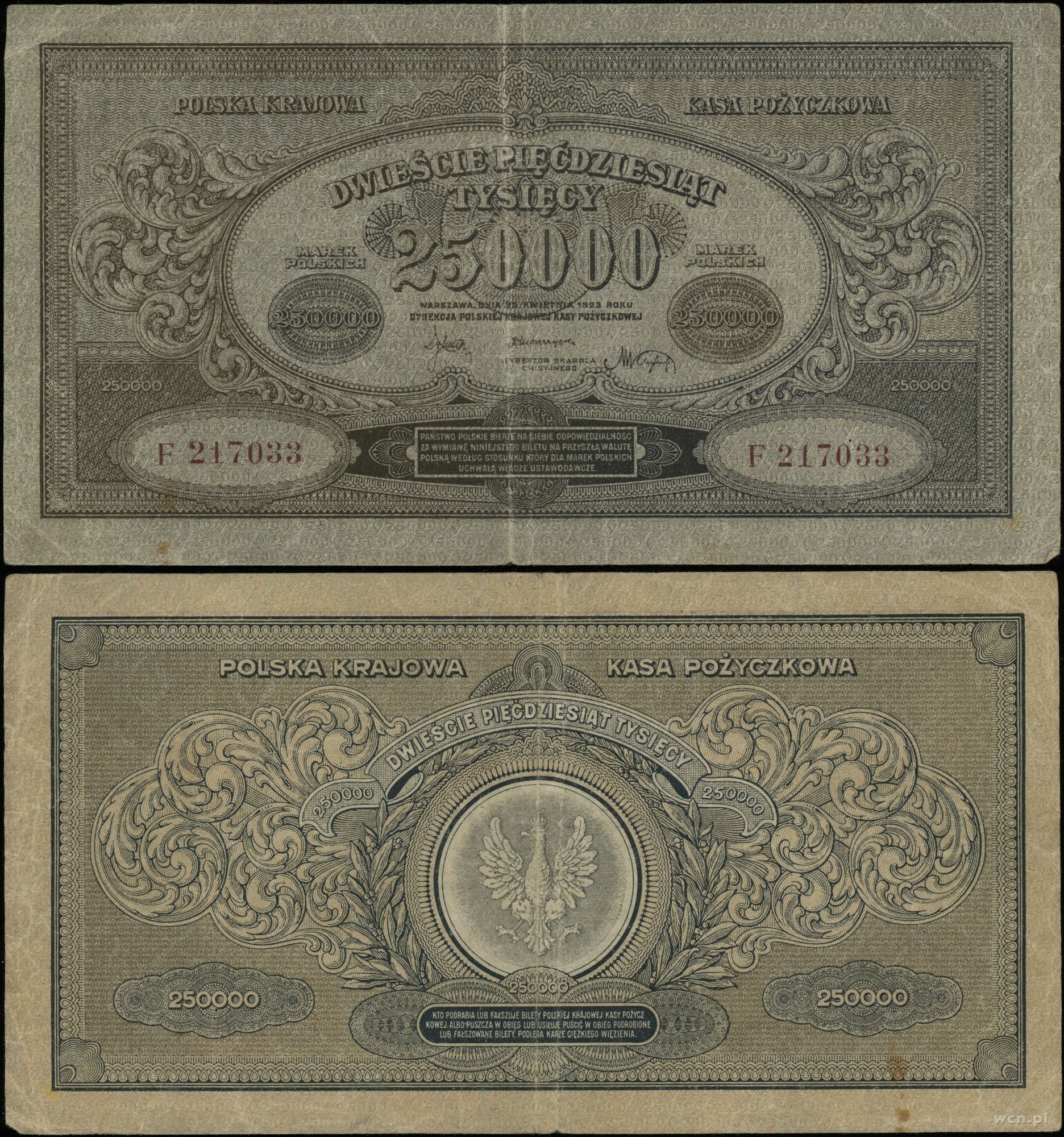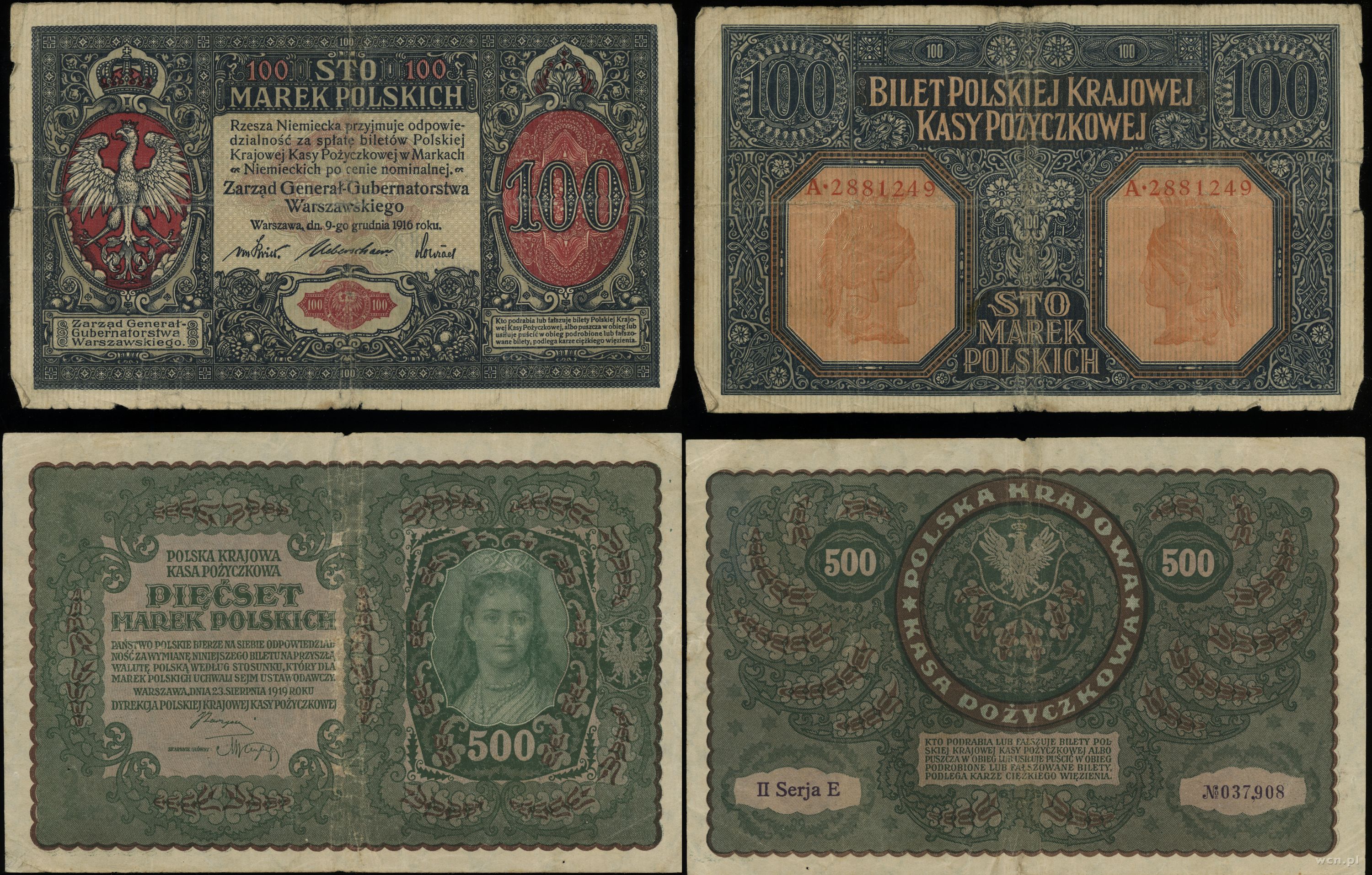 | Opis: | Polska, II Rzeczpospolita Polska (1918–1939) - emisje przed reformą Władysława Grabskiego, zestaw 5 banknotów 1916–1923, 1) 100 marek polskich 9.12.1916 seria A 2) 20 marek polskich 23.08.1919 seria II-FN 3) 100 marek polskich 23.08.1919 seria I-V 4) 500 marek polskich 23.08.1919 seria II-E 5) 250.000 marek polskich 25.04.1923 seria F, razem 5 sztuk, Miłczak 15–34a |