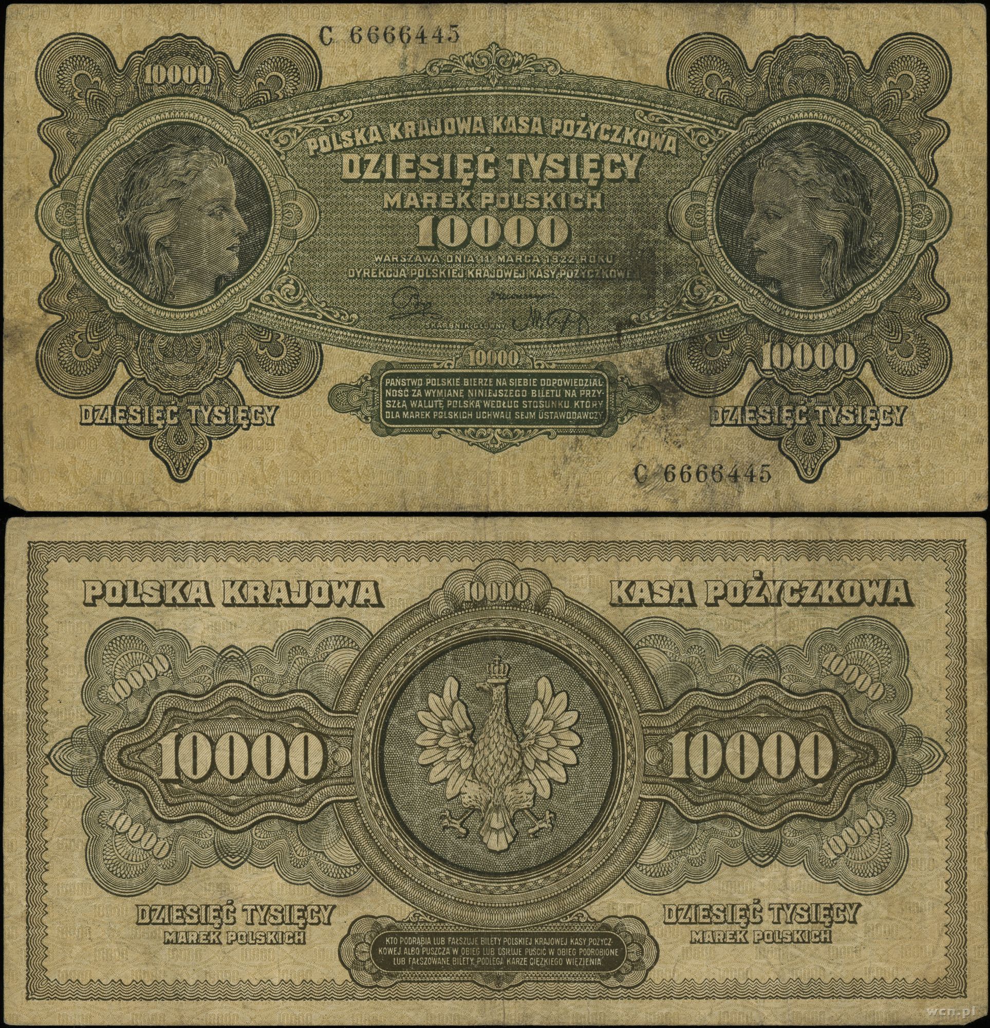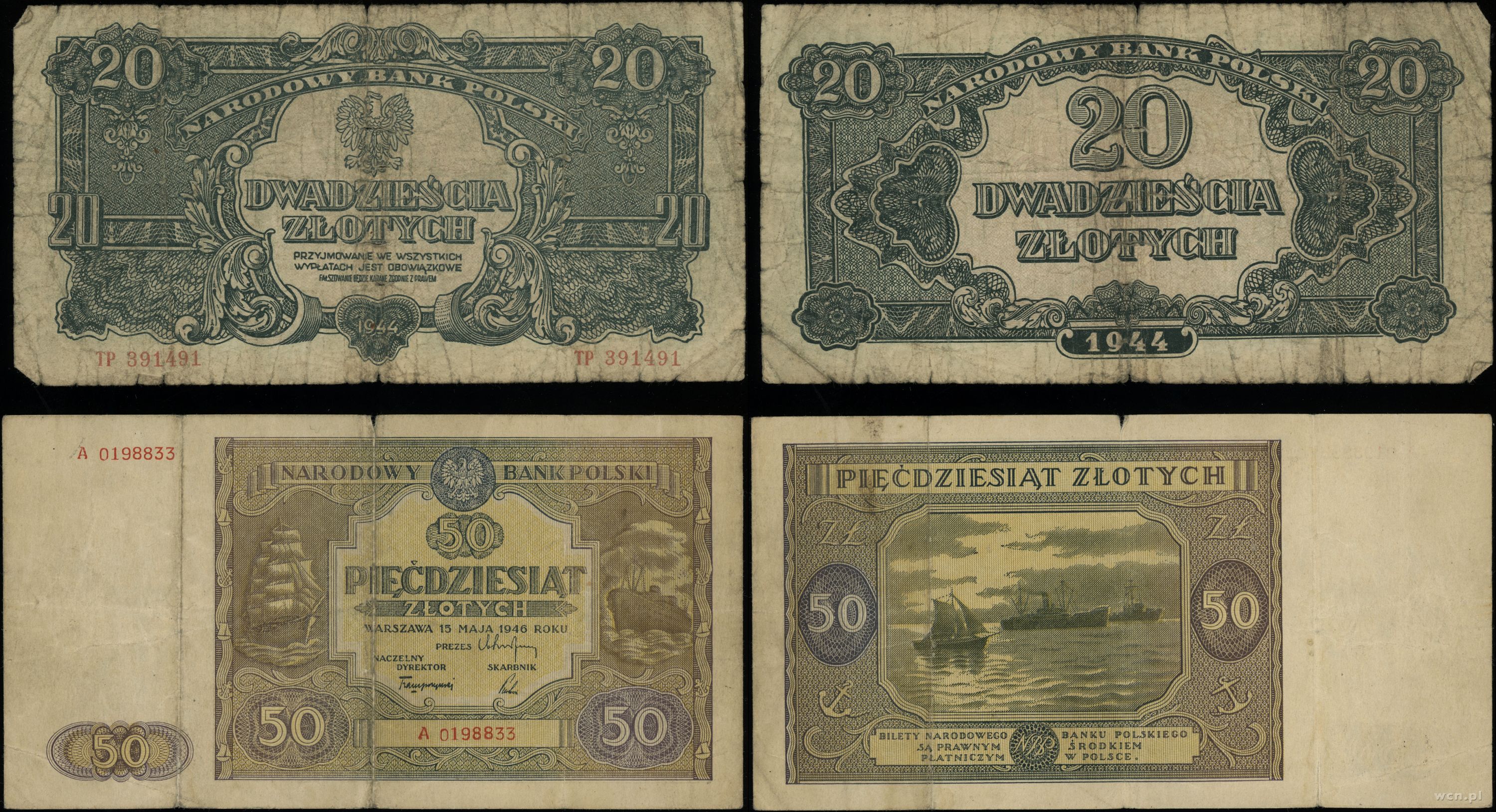 | Opis: | Polska, Polska powojenna (1944–1952), zestaw 6 banknotów 1922–1948, 1) 10.000 marek polskich 11.03.1922 seria C 2) 1 złoty 1.10.1938 seria IG 3) 20 złotych 1944 OBOWIĄZKOWE, seria TP 4) 2 złote 15.05.1946 bez oznaczenia serii 5) 50 złotych 15.05.1946 seria A 6) 5 złotych 1.07.1948 seria BH, razem 6 sztuk, Miłczak 32–135 |