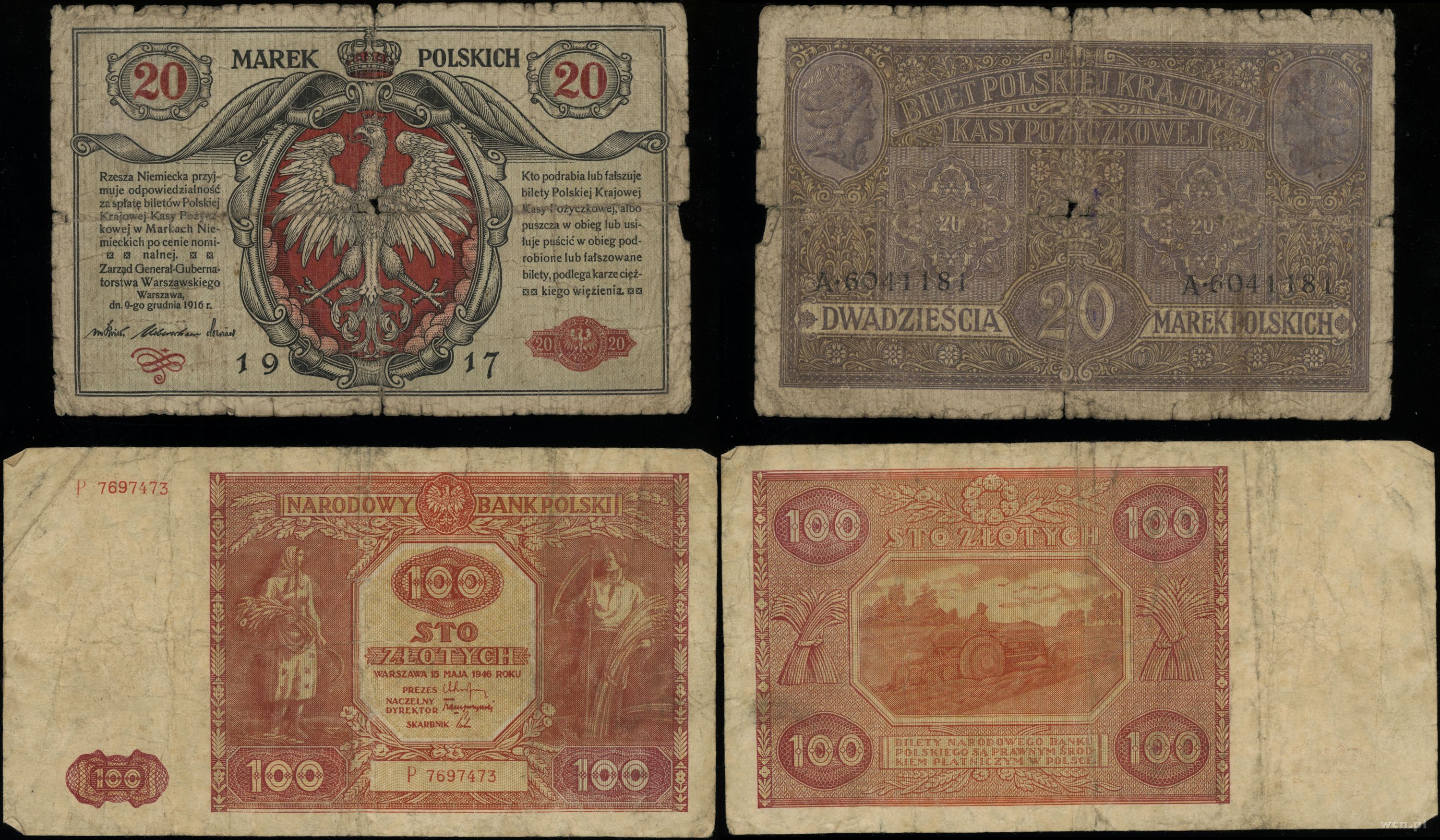 | Opis: | Polska, Polska powojenna (1944–1952), zestaw 6 banknotów 1916–1948, 1) 20 marek polskich 9.12.1916 seria A 2) 10.000 marek polskich 11.03.1922 seria A 3) 2 złote 15.05.1946 bez oznaczenia serii 4) 10 złotych 15.05.1946 bez oznaczenia serii 5) 100 złotych 15.05.1946 seria P 6) 5 złotych 1.07.1948 seria BR, razem 6 sztuk, Miłczak 14–135 |