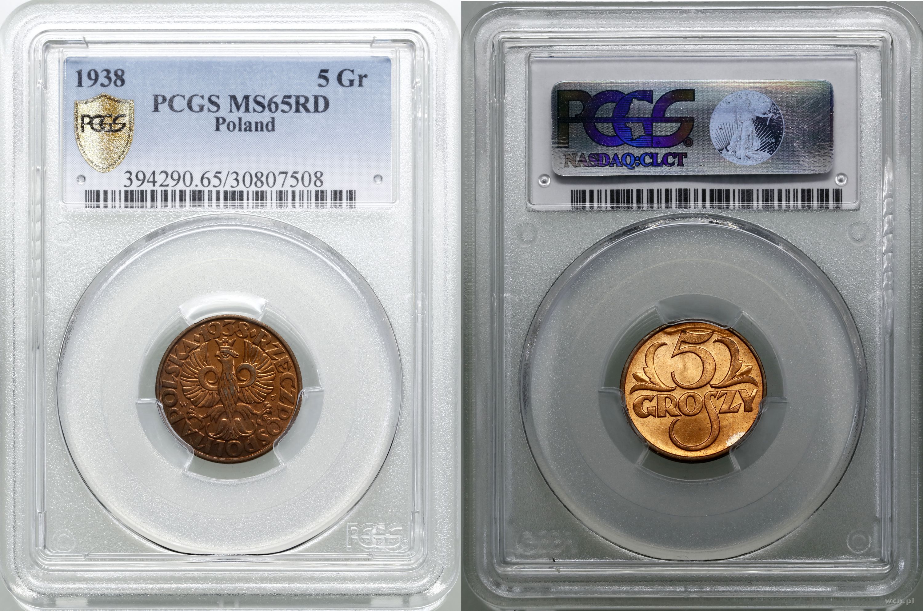 | Opis: | Polska, II Rzeczpospolita Polska (1918–1939) - monety obiegowe, 5 groszy 1938, Warszawa, piękne, z naturalną barwą , w opakowaniu firmy PCGS nr 394290.65/30807508 z oceną MS65 RD, Parchimowicz 103j |