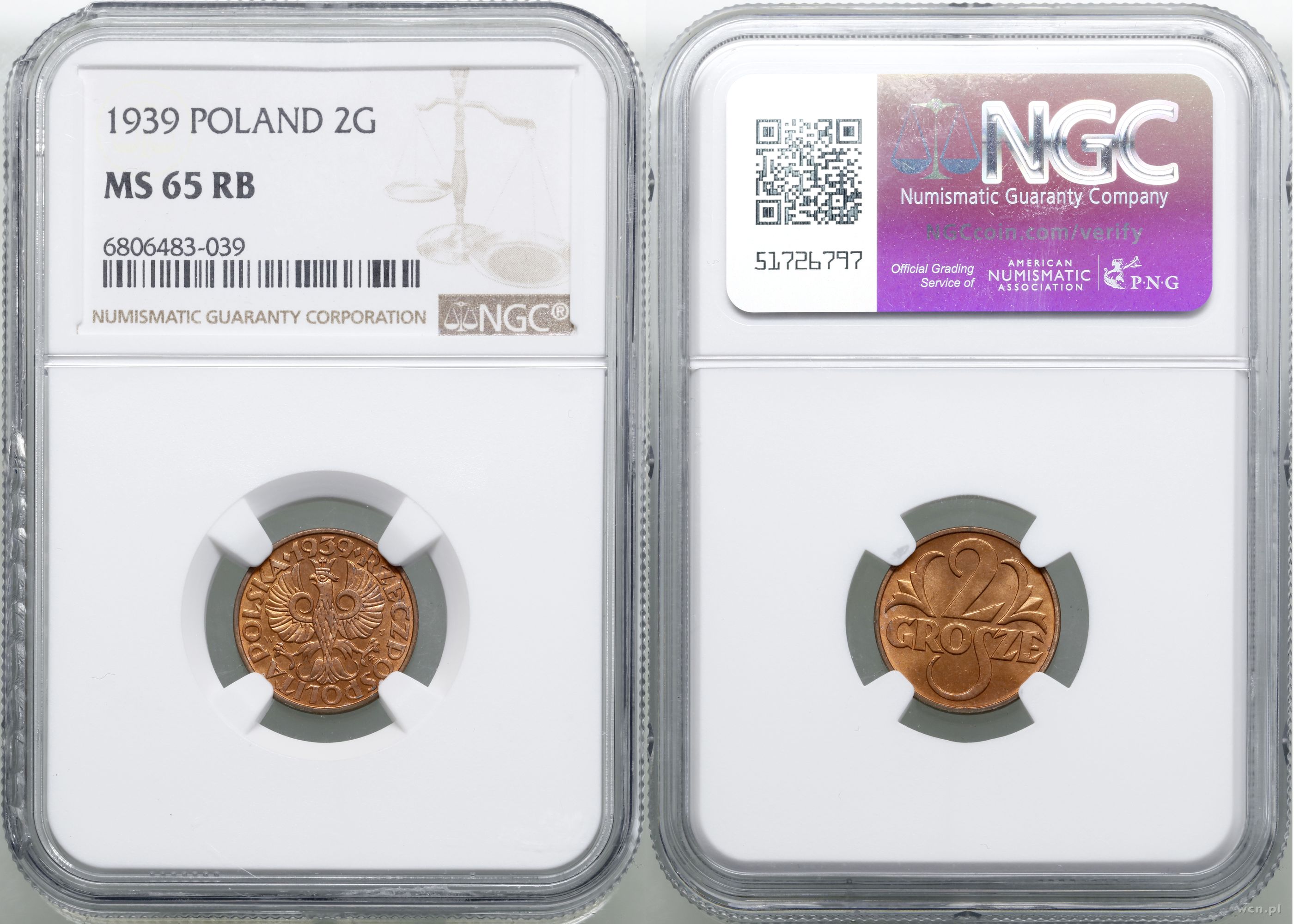 | Opis: | Polska, II Rzeczpospolita Polska (1918–1939) - monety obiegowe, 2 grosze 1939, Warszawa, piękne, podniszczone pudełko , w opakowaniu firmy NGC nr 6806483-039 z oceną MS65 RB, Parchimowicz 102n |