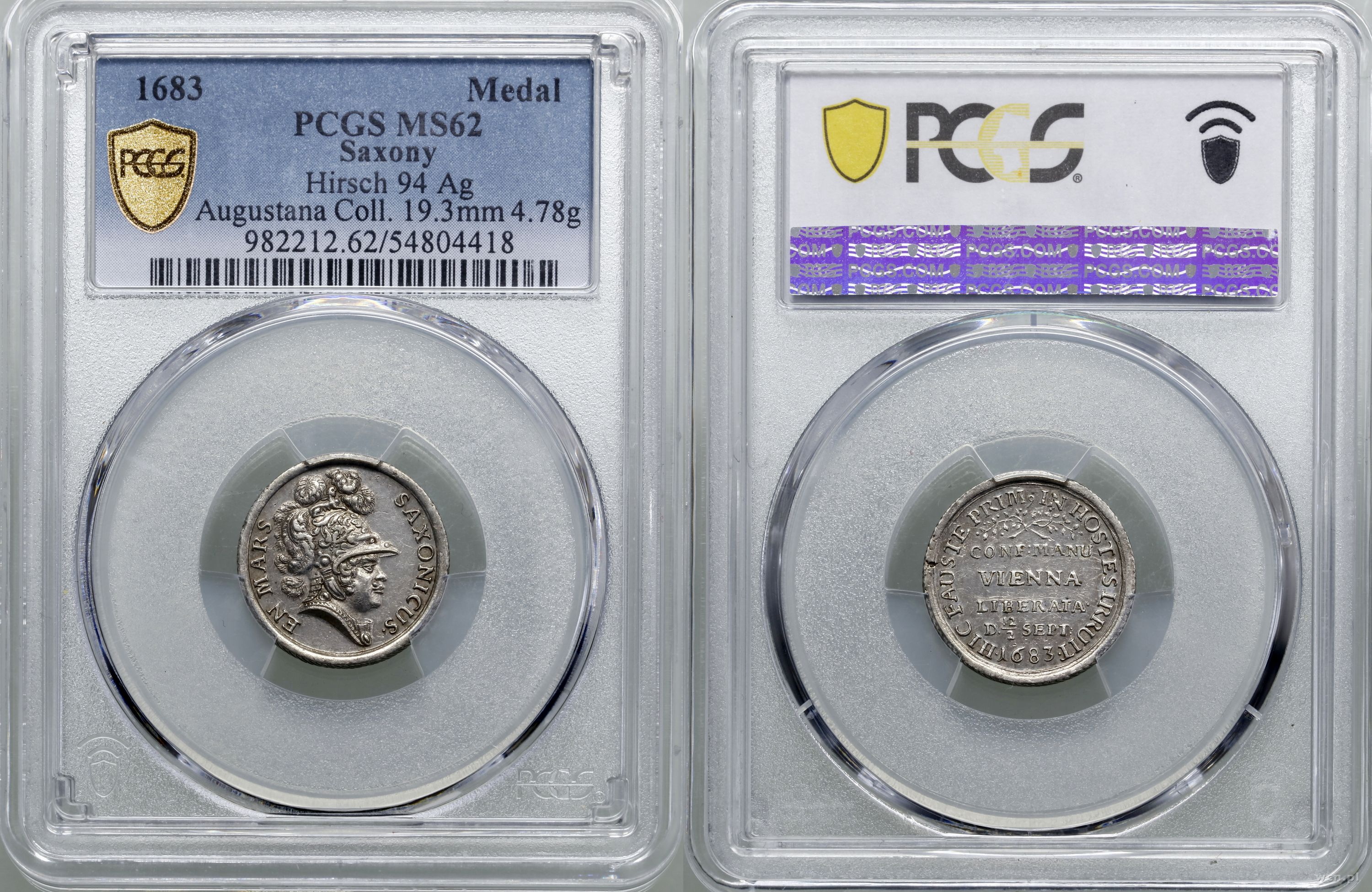 | Opis: | Niemcy, Saksonia - Jan Jerzy III (1680–1691), medal 1683, wybity z okazji obrony Wiednia, Aw: Głowa w prawo, w zabytkowym hełmie z piórami, EN MARS SAXONICUS; Rw: Poziomo CONF: MANU / VIENNA / LIBERATA, wokoło IN HOSTES IRRUIT ..., srebro 19.3 mm, 4.78 g, lekko przetarty, ale pięknie zachowany , w opakowaniu firmy PCGS nr 982212.62/54804418 z oceną MS62 |