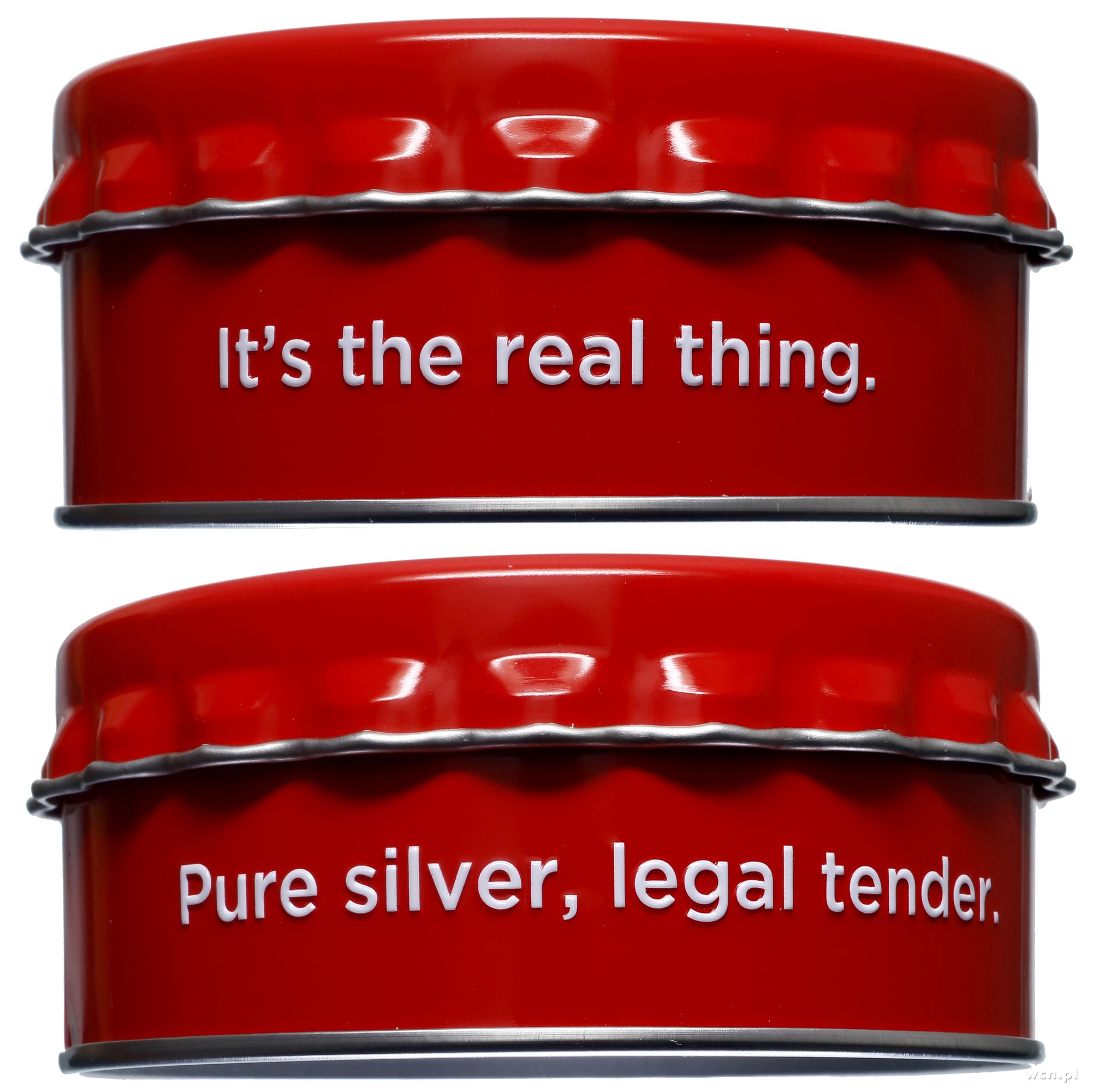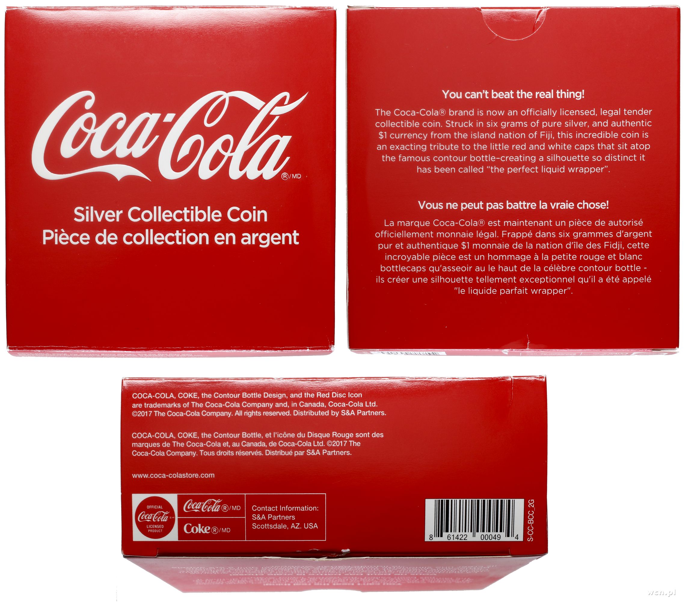| Opis: | Fidżi, Elżbieta II (1952–2022), 1 dolar (moneta w formie kapsla) 2018, Perth, Aw: głodło Fidżi, nominał, data oraz waga i próba srebra; Rw: logo Coca-Coli, srebro próby 999, wagi ok. 6 g, stemple lustrzane, moneta w oryginalnym metalowym pudełku z certyfikatem numer 0012717, KM UC 212 |