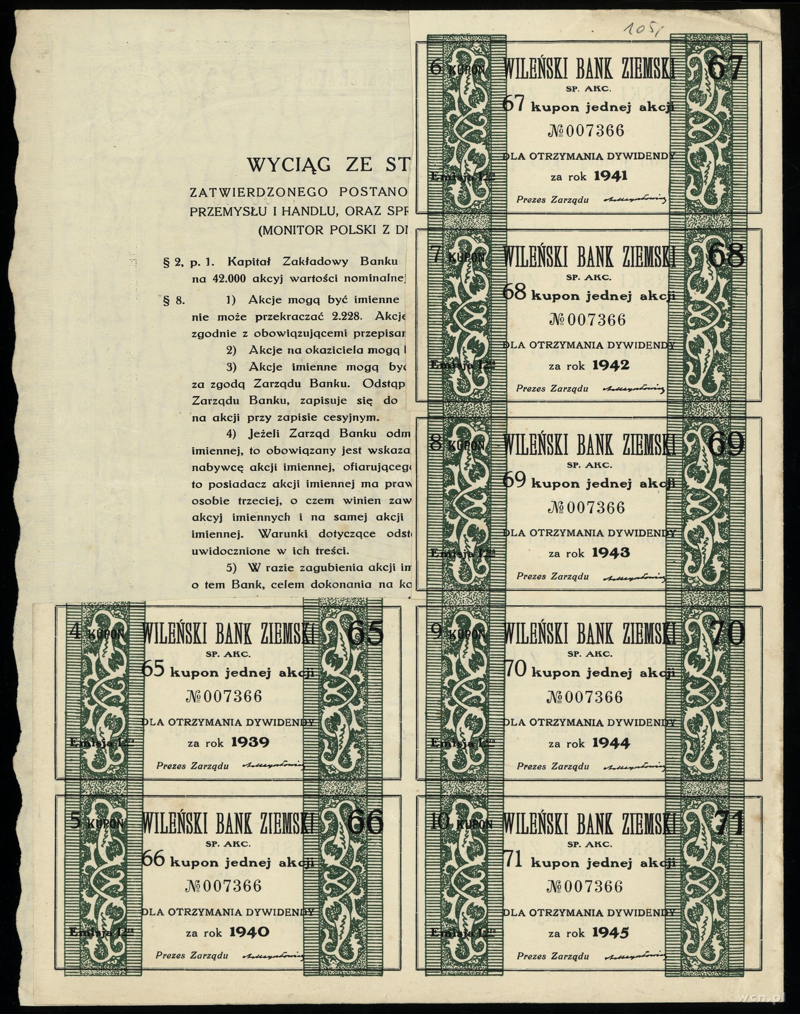 | Opis: | Polska, Wileński Bank Ziemski, 1 akcja na 150 złotych 1937, Wilno, emisja 1, numeracja 007366, wraz z 7 kuponami, zgięta w pionie i poziomie, Koziorowski 2241/7 |