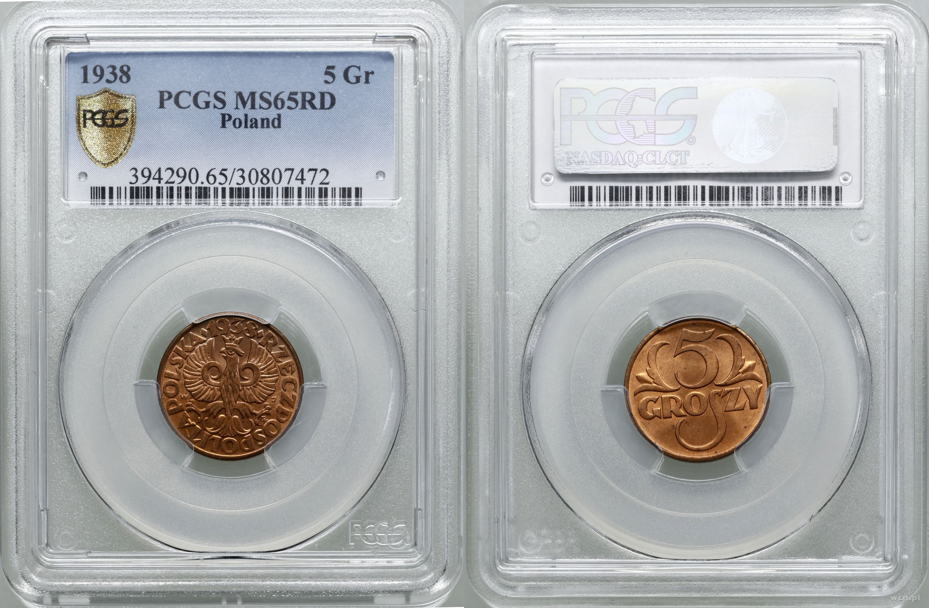 | Opis: | Polska, II Rzeczpospolita Polska (1918–1939) - monety obiegowe, 5 groszy 1938, Warszawa, pięknie zachowana moneta, w naturalnej barwie , w opakowaniu firmy PCGS nr 394290.65/30807472 z oceną MS65 RD, Parchimowicz 103j |