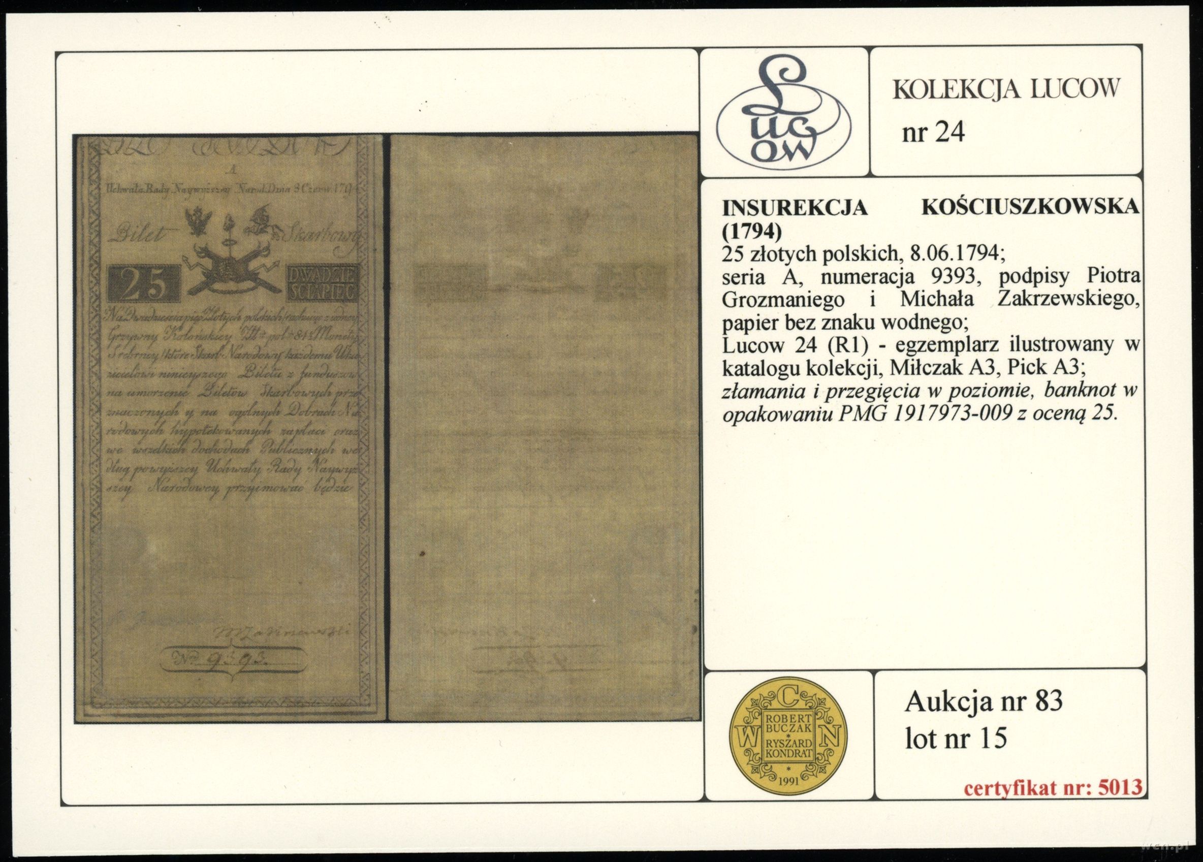 | Opis: | Polska, Insurekcja Kościuszkowska (1794), 25 złotych polskich 8.06.1794, seria A, numeracja 9393, podpisy Piotra Grozmaniego i Michała Zakrzewskiego, papier bez znaku wodnego, złamania i przegięcia w poziomie , w opakowaniu firmy PMG nr 1917973-009 z oceną 25 VF, Lucow 24 (R1) - egzemplarz ilustrowany w katalogu kolekcji, Miłczak A3, Pick A3 |