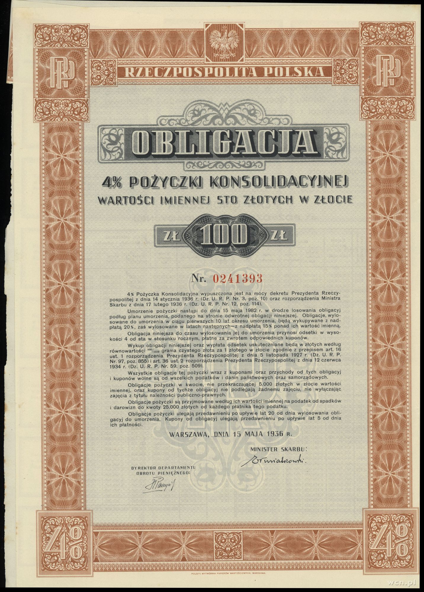 | Opis: | Rzeczpospolita Polska (1918–1939), Ministerstwo Skarbu, zestaw 2 obligacji 1935–1936, Warszawa, 1) obligacja 3% premiowej pożyczki inwestycyjnej na 100 złotych w złocie II emisja, 1935 2) obligacja 4 % pożyczki konsolidacyjnej na 100 złotych w złocie, 1936, razem 2 sztuki, Mazur E.37.4, Moczydłowski 95 / Moczydłowski 102 |