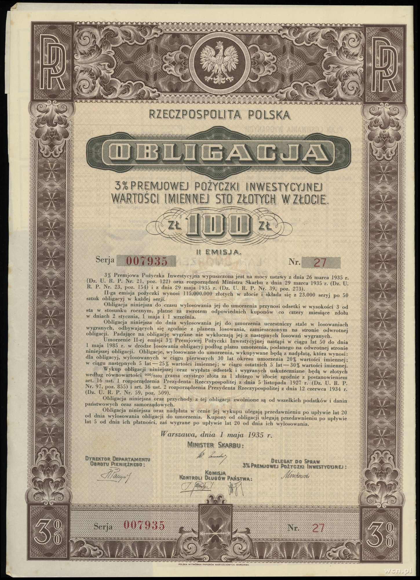 | Opis: | Rzeczpospolita Polska (1918–1939), Ministerstwo Skarbu, zestaw 2 obligacji 1934–1935, 1) obligacja 6% na 50 złotych w złocie 2.01.1934, Warszawa 2) obligacja 3% premjowej pożyczki inwestycyjnej wartości imiennej 100 złotych w złocie 1.05.1935, Warszawa, razem 2 sztuki, Moczydłowski 85 / Moczydłowski 94 |