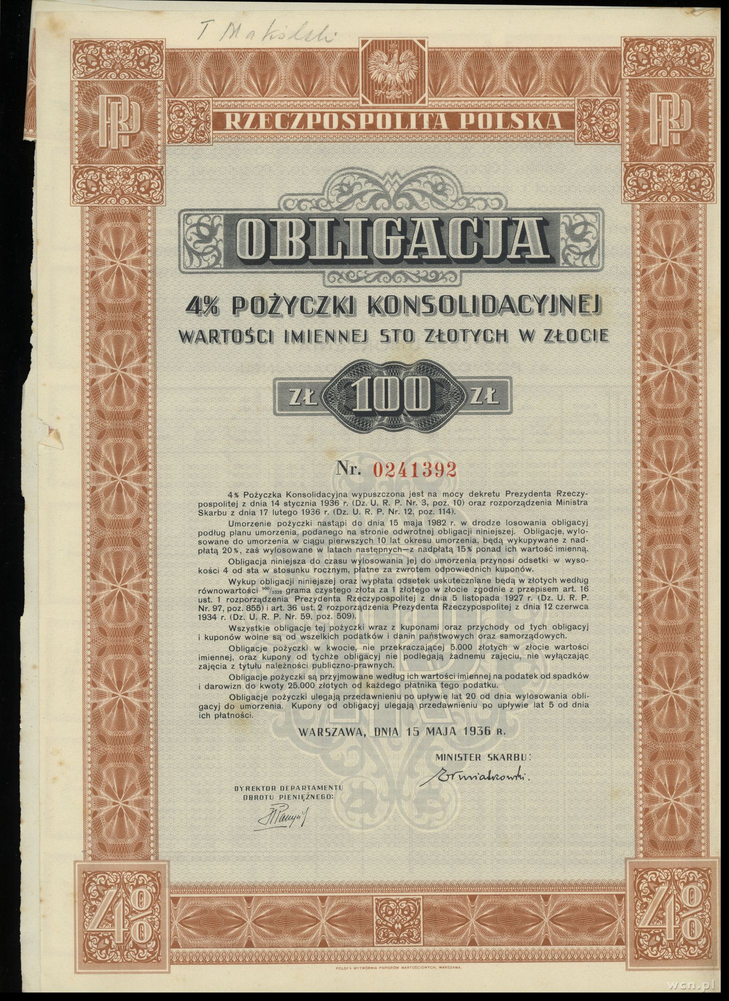 | Opis: | Rzeczpospolita Polska (1918–1939), zestaw 2 obligacji 1934–1936, 1) obligacja 6% na 50 złotych w złocie 2.01.1934, Warszawa 2) obligacja 4 % pożyczki konsolidacyjnej na 100 złotych w złocie 15.05.1936, Warszawa, razem 2 sztuki, Moczydłowski 85 / Moczydłowski 102 |