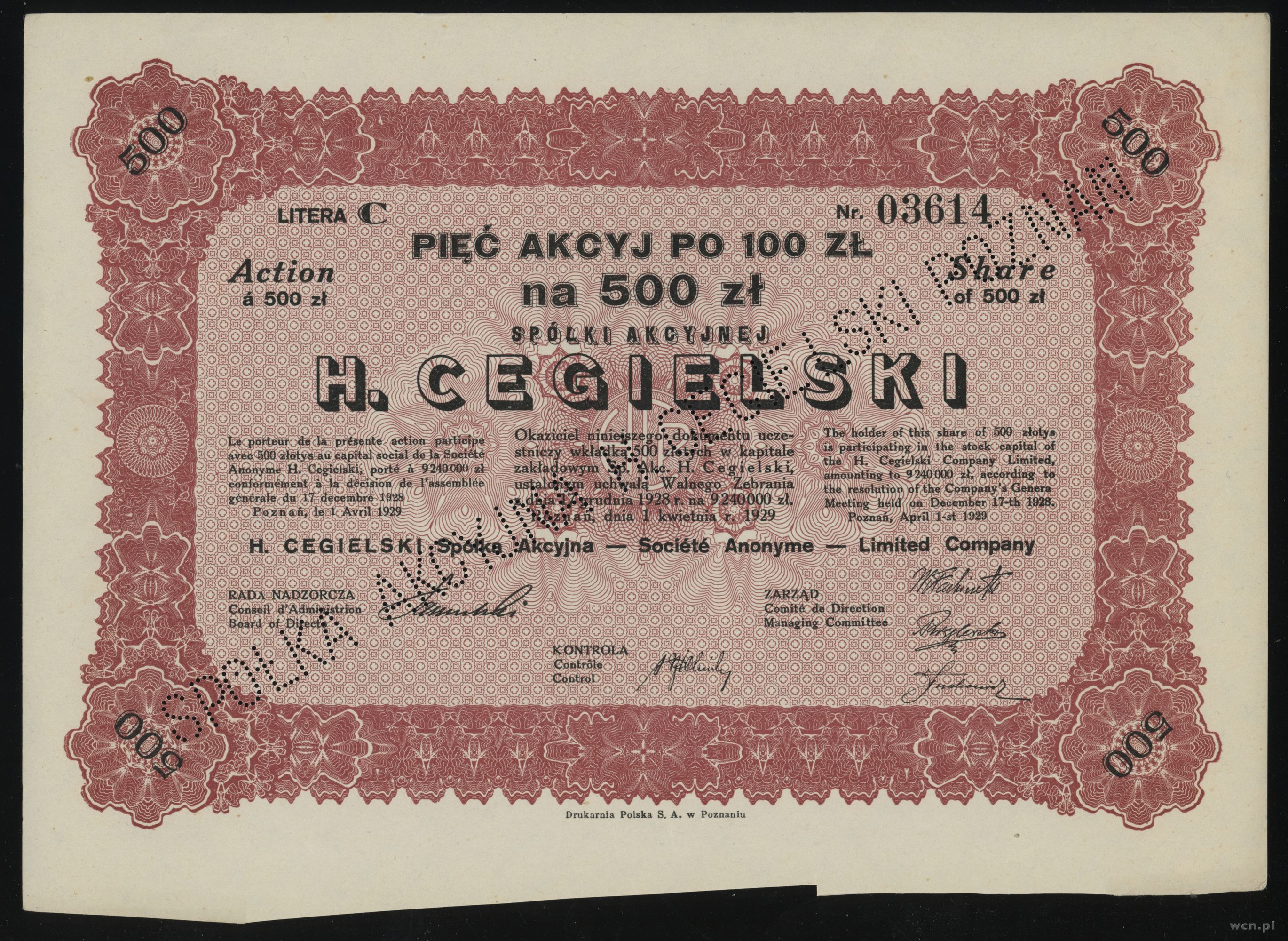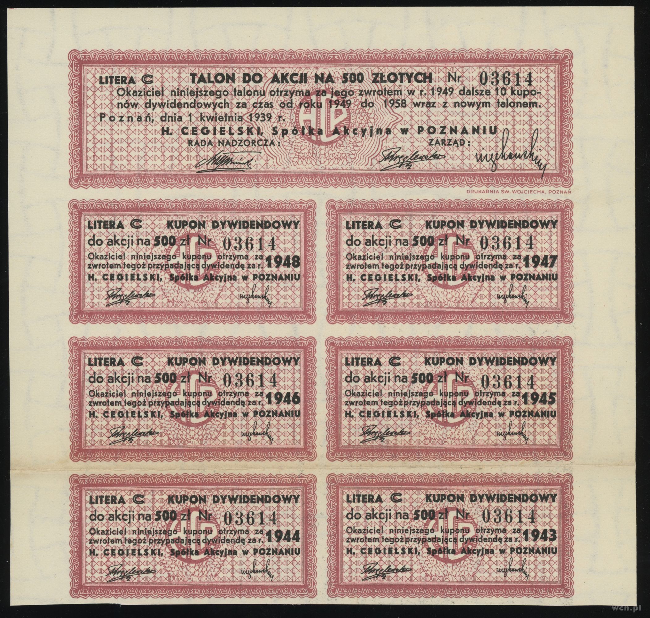 | Opis: | Polska, zestaw 2 akcji 1929–1931, 1) 5 akcji po 100 złotych = 500 złotych, 1.04.1929, Poznań, H. Cegielski S.A. 2) 1 akcja na 100 złotych 1931, Warszawa, Warszawskie Towarzystwo Ubezpieczeń S.A., razem 2 sztuki, Koziorowski 721/23, Niegrzybowski VI-A-26 / Koziorowski 2212/1, Niegrzybowski II-A-23 |