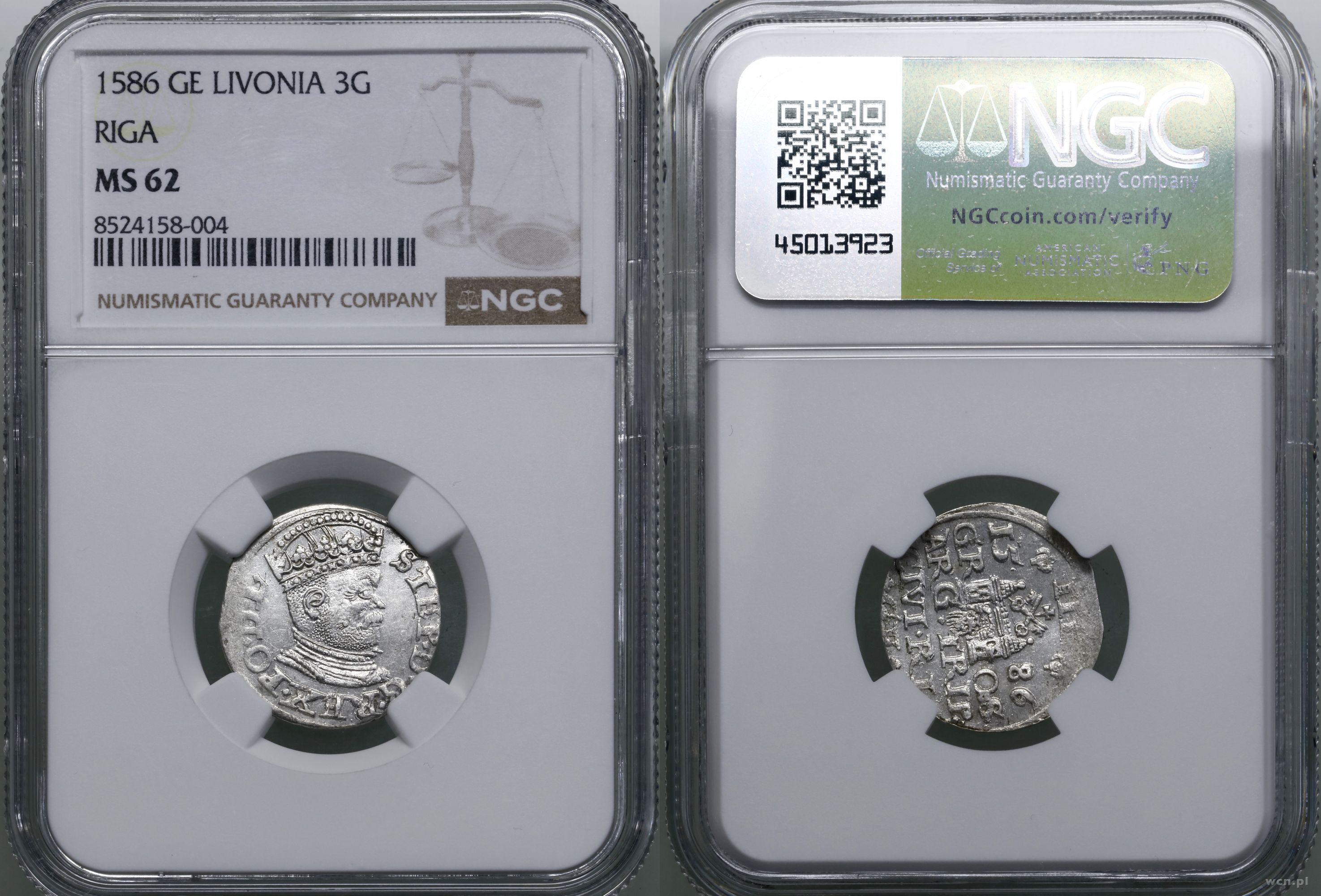 | Opis: | Polska, Stefan Batory (1576–1586) - miasto Ryga, trojak 1586, Ryga, mała głowa króla, końcówka PO D L, piękny , w opakowaniu firmy NGC nr 8524158-004 z oceną MS62, Iger R.86.2.d, K.-G. 7 |