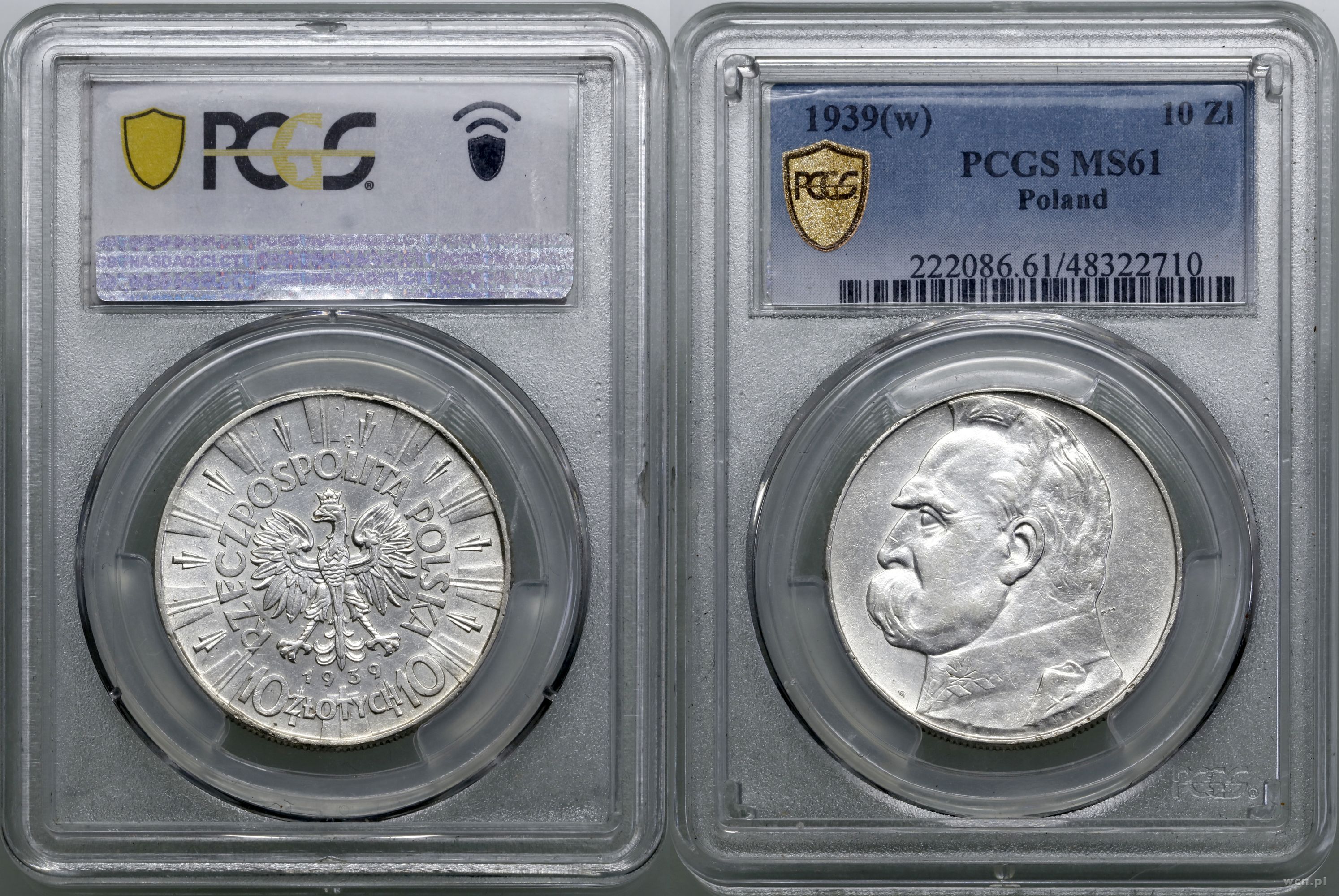 Opis: Polska, II Rzeczpospolita Polska (1918–1939) - monety obiegowe, 10 złotych 1939, Warszawa, Józef Piłsudski, pięknie zachowana moneta , w opakowaniu firmy PCGS nr 222086.61/48322710 z oceną MS61, Parchimowicz 124f