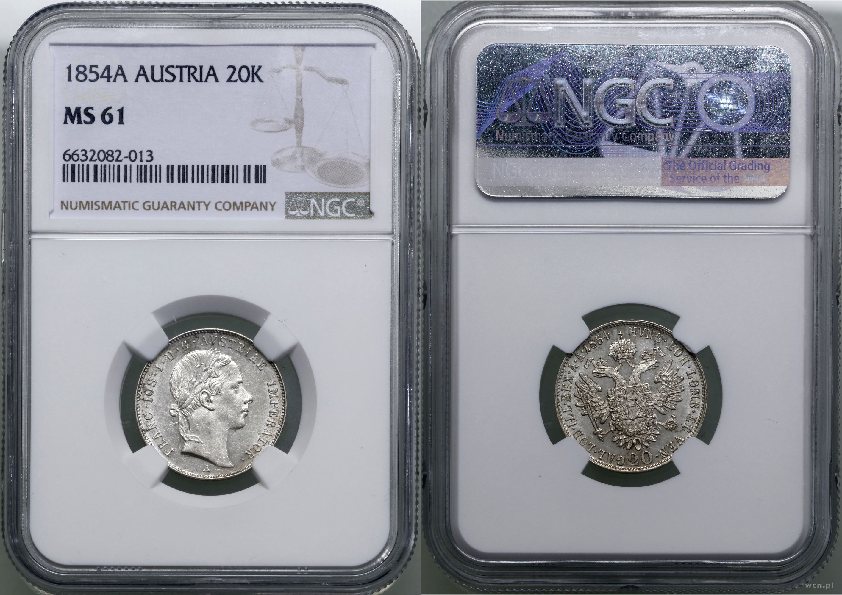Opis: Austria, Franciszek Józef I (1848–1916), 20 krajcarów 1854 A, Wiedeń, piękne , w opakowaniu firmy NGC nr 6632082-013 z oceną MS61, Herinek 672, KM 2211