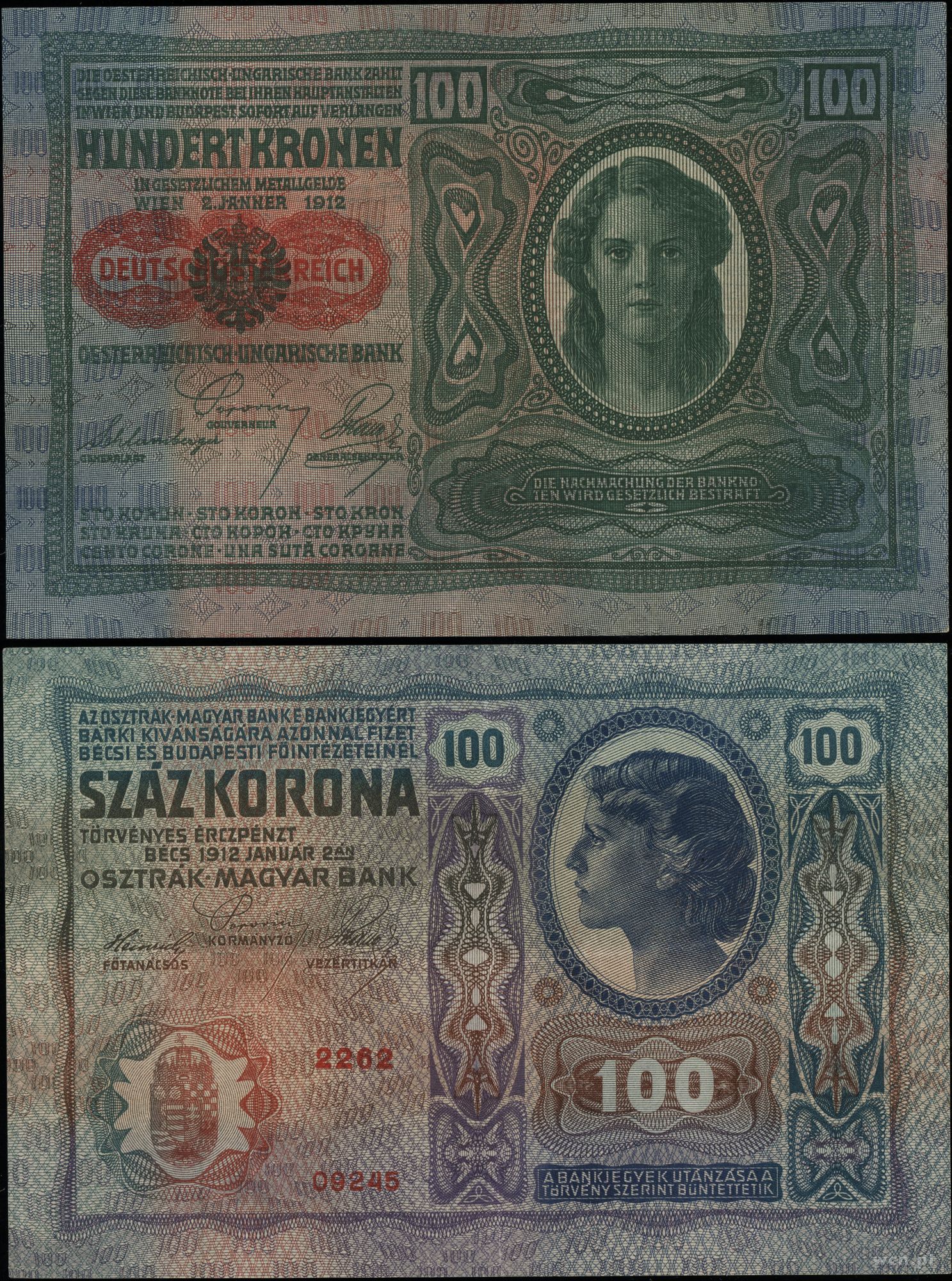 | Opis: | Austria, Austro-Hungarian Bank, zestaw 3 banknotów z nadrukami DEUTSCHÖSTERREICH 1919/1920, 20 koron 2.01.1913, II emisja, seria 1171 / 472517; 50 koron 2.01.1914, seria 1067 / 240446; 100 koron 2.01.1912, seria 2262 / 09245, razem 3 sztuki, 20 koron pięknie zachowane, reszta ze złamaniami, Pick/Richter 197a, 198a, 199a |