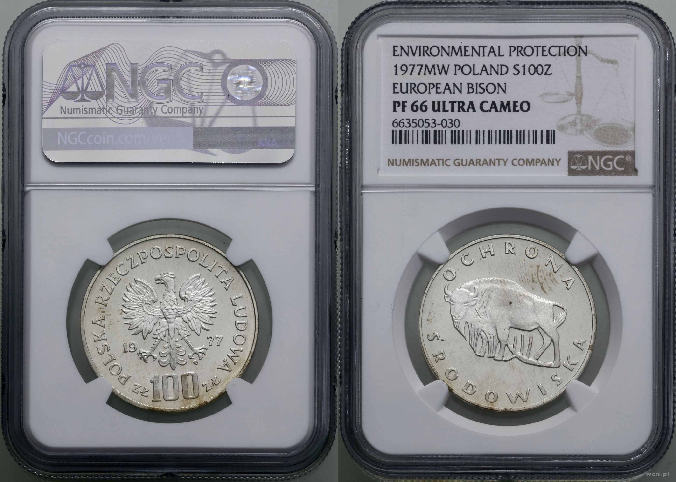 | Opis: | Polska, Polska Rzeczpospolita Ludowa (1952–1989) - monety obiegowe i kolekcjonerskie, 100 złotych 1977, Warszawa, Ochrona środowiska – Żubr, srebro próby 625, nakład 30.050 sztuk, stemple lustrzane, patyna , w opakowaniu firmy NGC nr 6635053-030 z oceną PF66 ULTRACAMEO, Parchimowicz 276 |