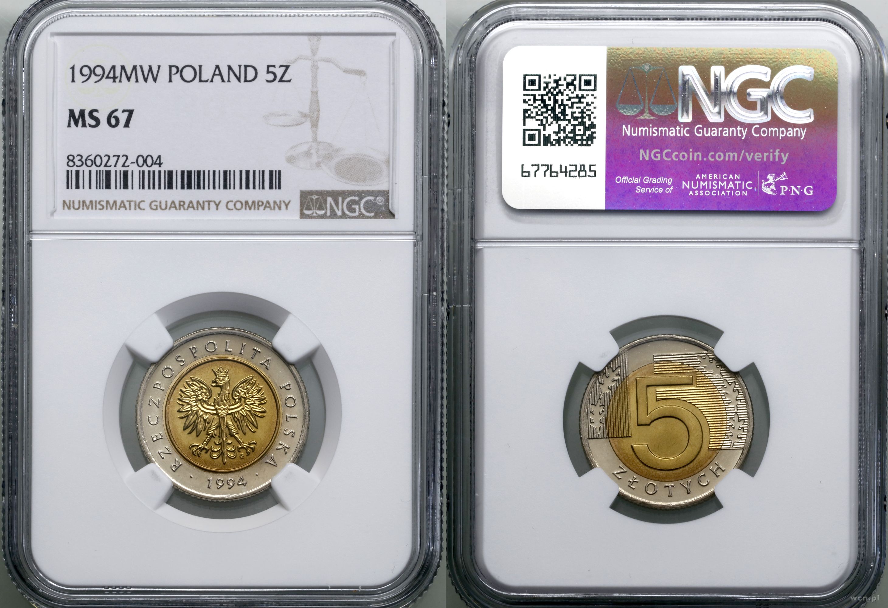 | Opis: | Polska, III Rzeczpospolita Polska (od 1989) - monety obiegowe, 5 złotych 1994, Warszawa, wyśmienite , w opakowaniu firmy NGC nr 8360272-004 z oceną MS67, Parchimowicz 715 |