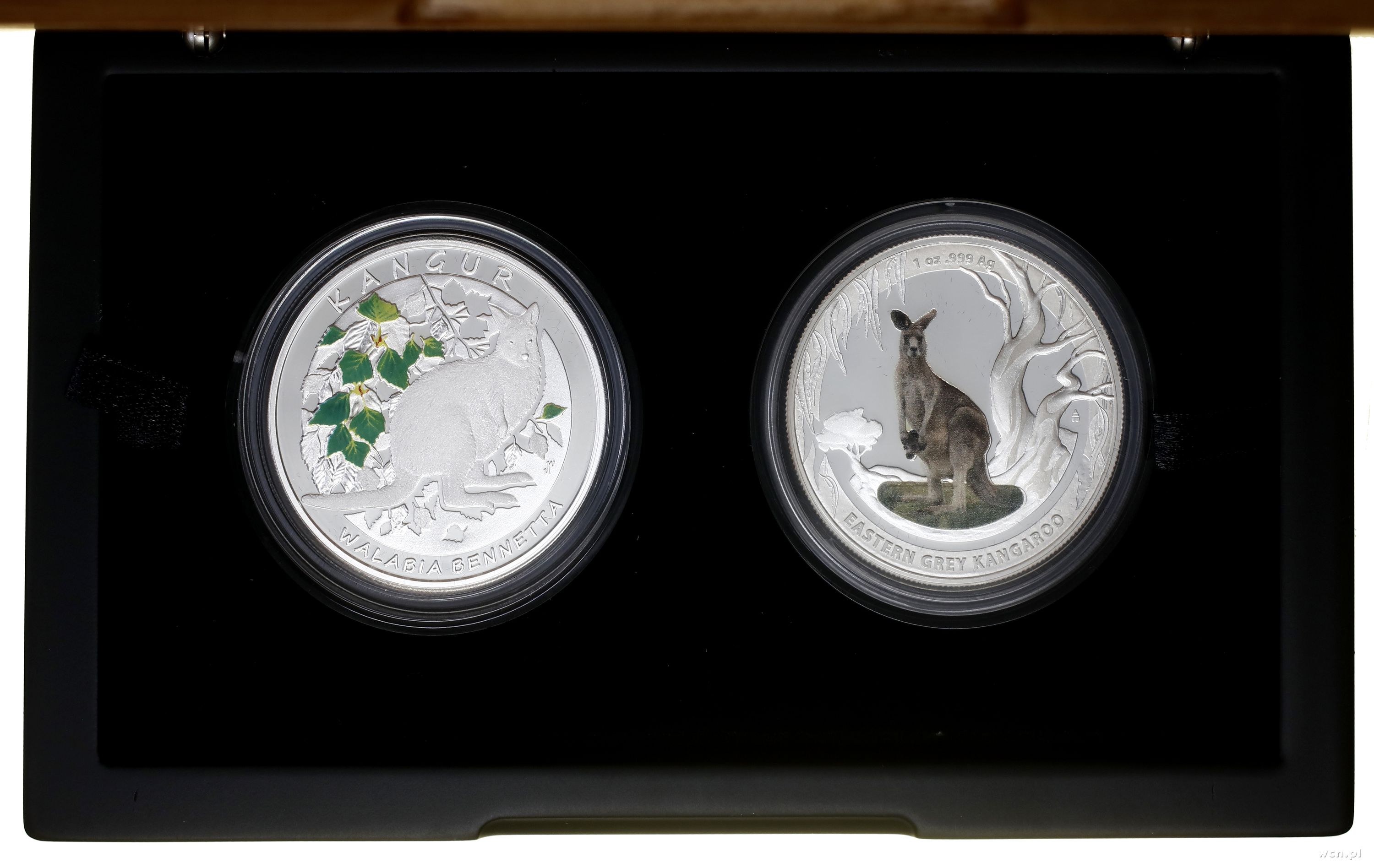 | Opis: | Polska, III Rzeczpospolita Polska (od 1989) - monety kolekcjonerskie, zestaw 2 monet 2013, w skład zestawu wchodzą monety z serii Kangury Świata: 1) Polska, 20 złotych, 2013, Warszawa, Kangur Walabia Bennetta, 2) Australia, 1 dolar, 2013, Kangur olbrzymi, srebro próby 999, 2 x 1 uncja, stemple lustrzane, monety w plastikowych kapslach i eleganckim pudełku z certyfikatem nr 0004732, nakład 10.000 sztuk, Parchimowicz 1293, KM 1946 |