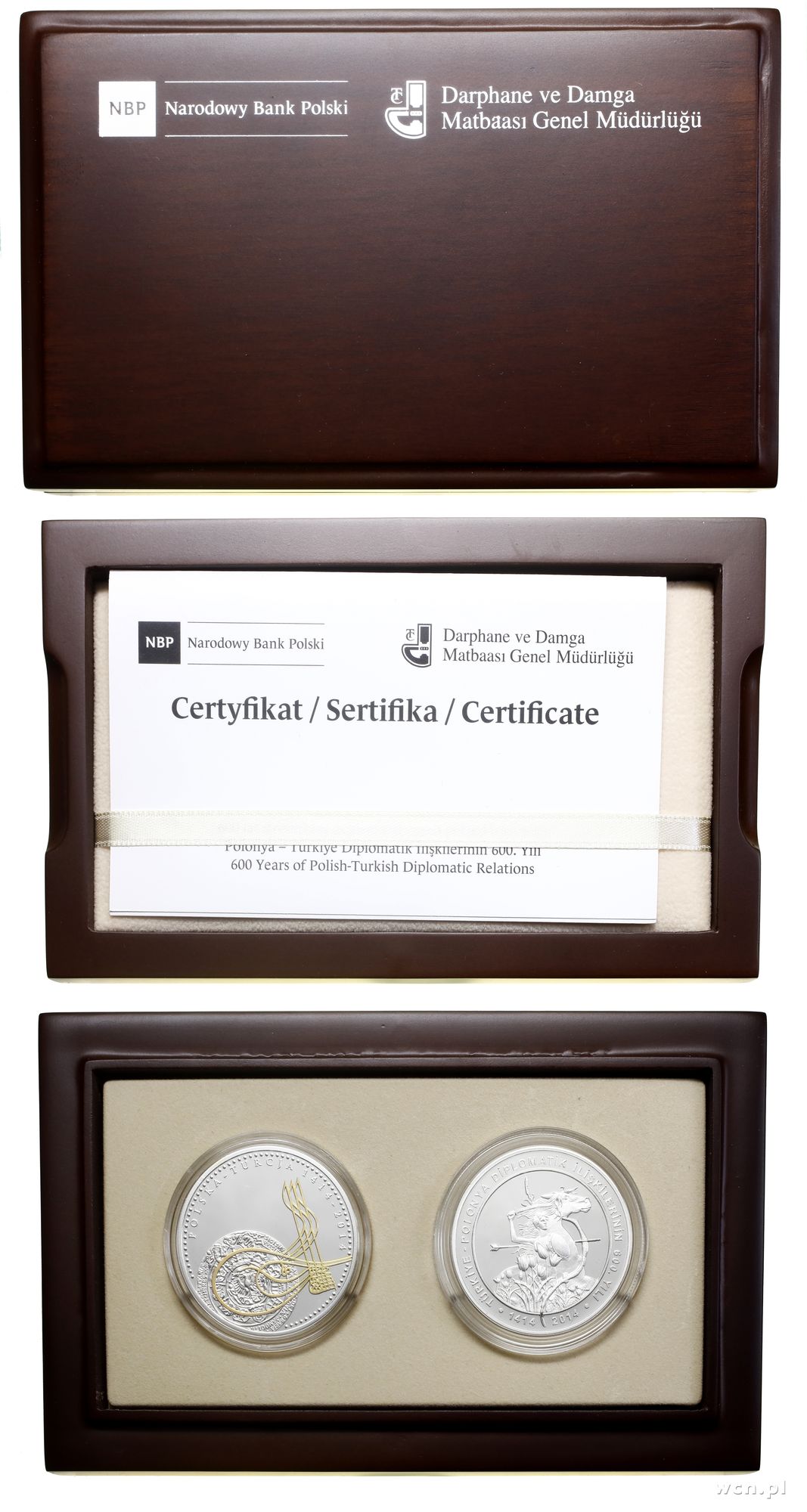 | Opis: | Polska, III Rzeczpospolita Polska (od 1989) - monety kolekcjonerskie, zestaw 2 monet 2014, Warszawa, 600 lat stosunków dyplomatycznych polsko-tureckich, srebro próby 925, waga 2 x 31.1 g, razem 2 sztuki w pamiątkowym drewnianym pudełku Narodowego Banku Polskiego / Darphane ve Damga, nakład 10.000 sztuk, Parchimowicz 1321, KM 1299 |