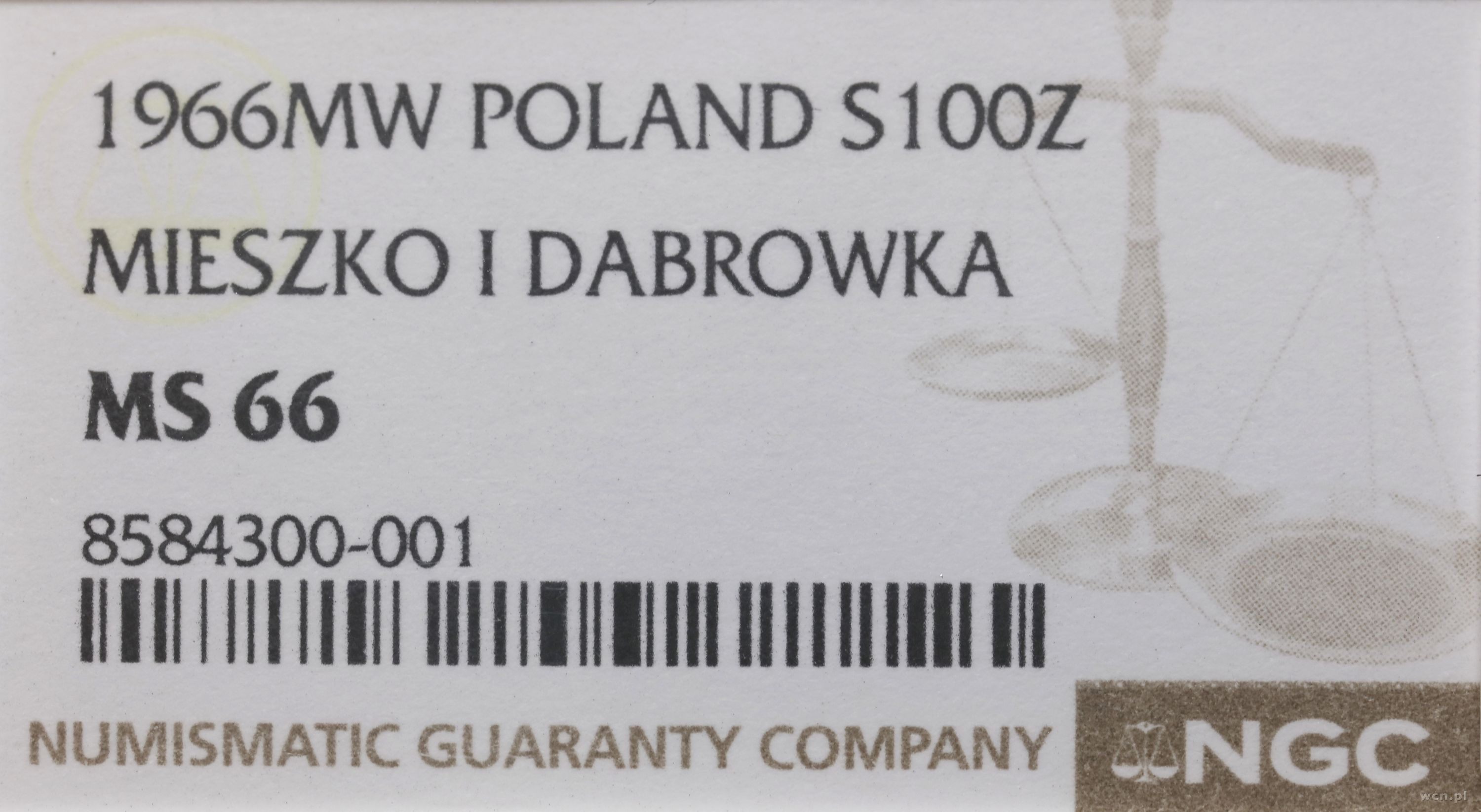 | Opis: | Polska, Polska Rzeczpospolita Ludowa (1952–1989) - monety obiegowe i kolekcjonerskie, 100 złotych 1966, Warszawa, Tysiąclecie Państwa Polskiego – Mieszko i Dąbrówka, wyśmienite , w opakowaniu firmy NGC nr 8584300-001 z oceną MS66, Parchimowicz 268 |