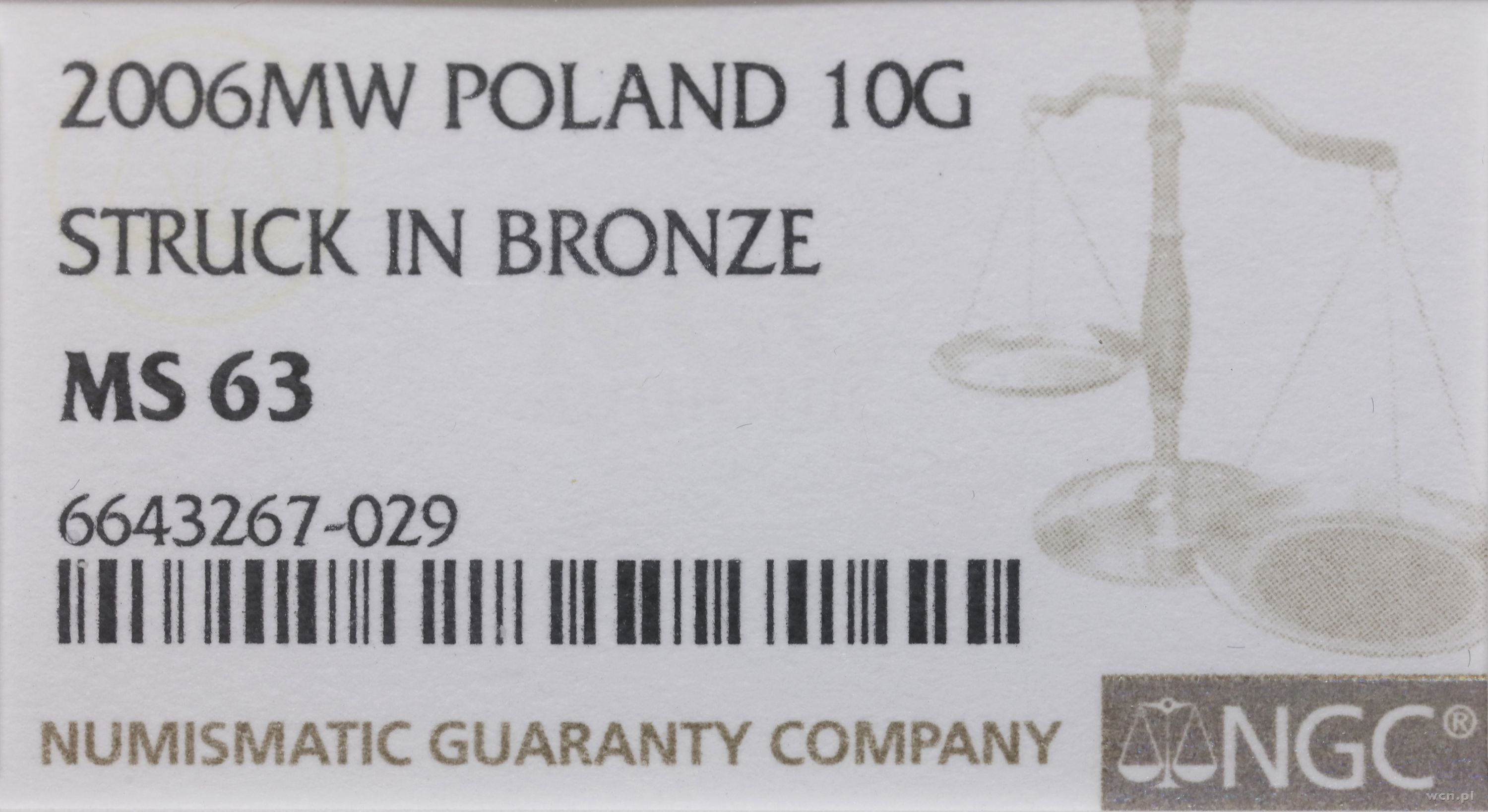 | Opis: | Polska, III Rzeczpospolita Polska (od 1989) - próby technologiczne monet, 10 groszy 2006, Warszawa, bez napisu PRÓBA, bardzo rzadka odbitka monety obiegowej w brązie, wybita w nieznanym nakładzie , w opakowaniu firmy NGC nr 6643267-029 z oceną MS63, Parchimowicz - nie notuje w tym metalu |