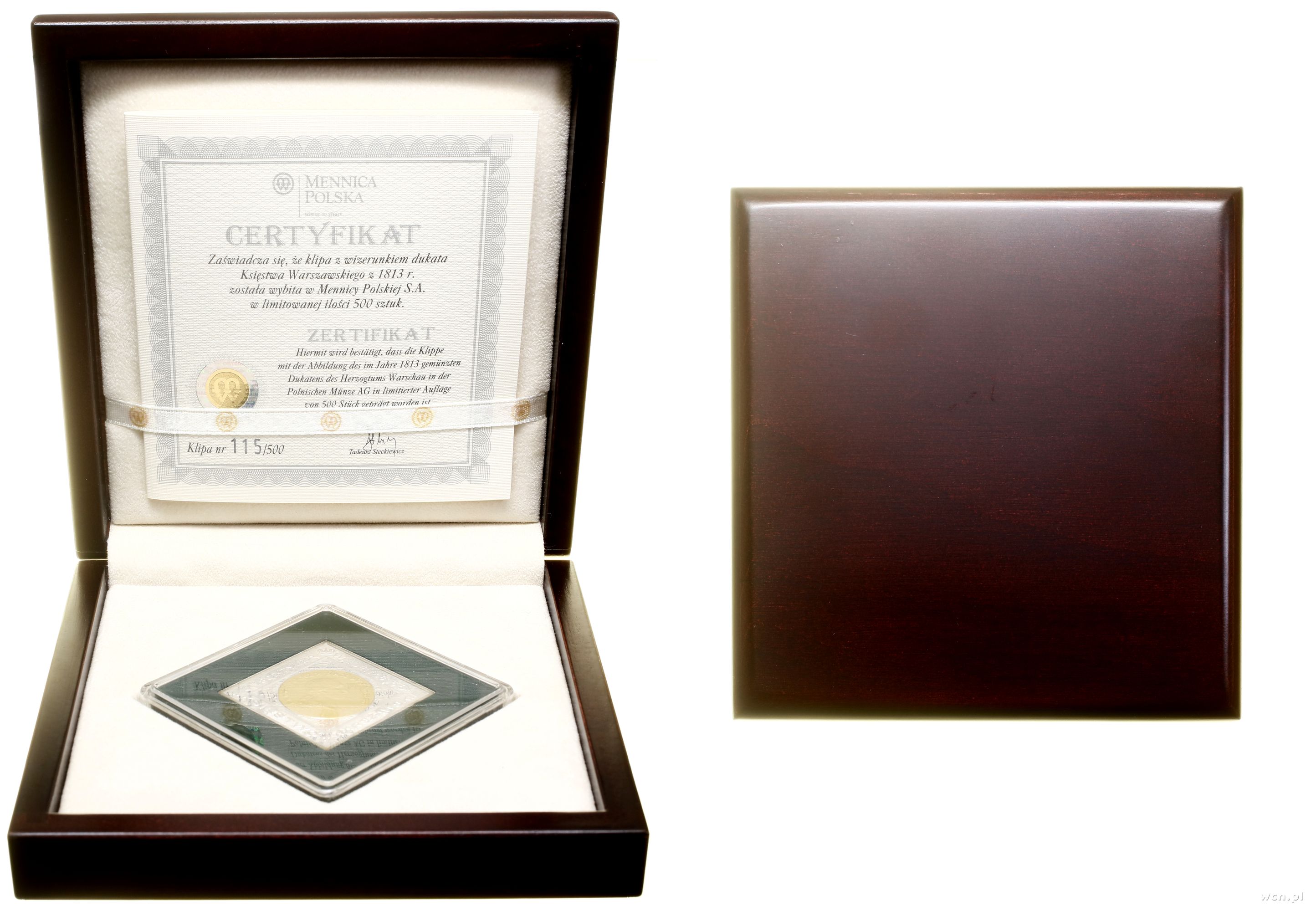 | Opis: | Polska, III Rzeczpospolita Polska (od 1989) - Mennica Warszawska, klipa dukata Księstwa Warszawskiego 2007, Warszawa, srebro próby 925, ok. 28.28 g, rdzeń platerowany złotem, stemple lustrzane, nakład tylko 500 sztuk, klipa w drewnianym pudełku z dołączonym certyfikatem NBP nr. 115 |
