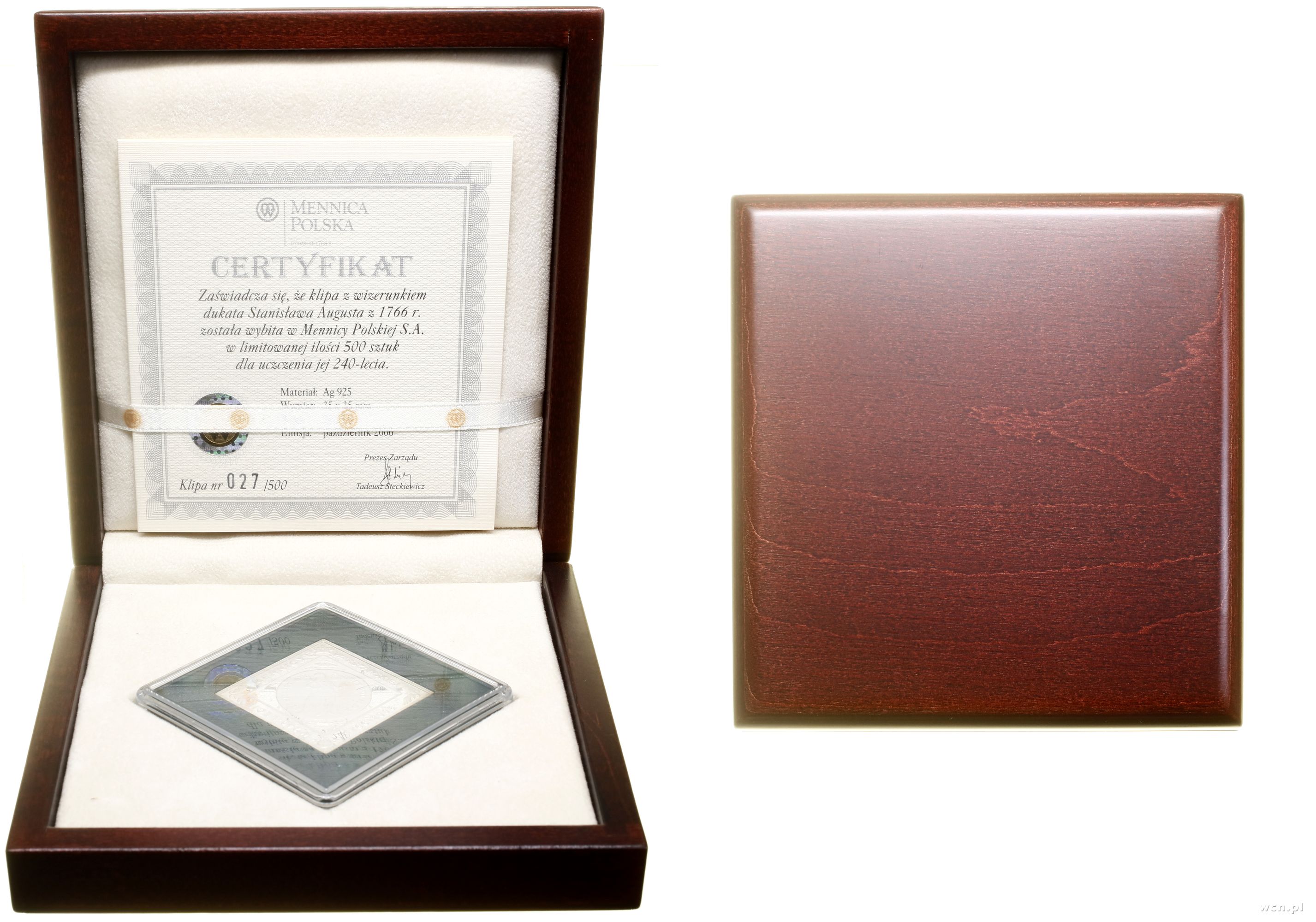 | Opis: | Polska, III Rzeczpospolita Polska (od 1989) - Mennica Warszawska, klipa dukata Stanisława Augusta 2006, Warszawa, srebro próby 925, ok. 28.28 g, stemple lustrzane, nakład tylko 500 sztuk, klipa w drewnianym pudełku z dołączonym certyfikatem NBP nr. 027 |