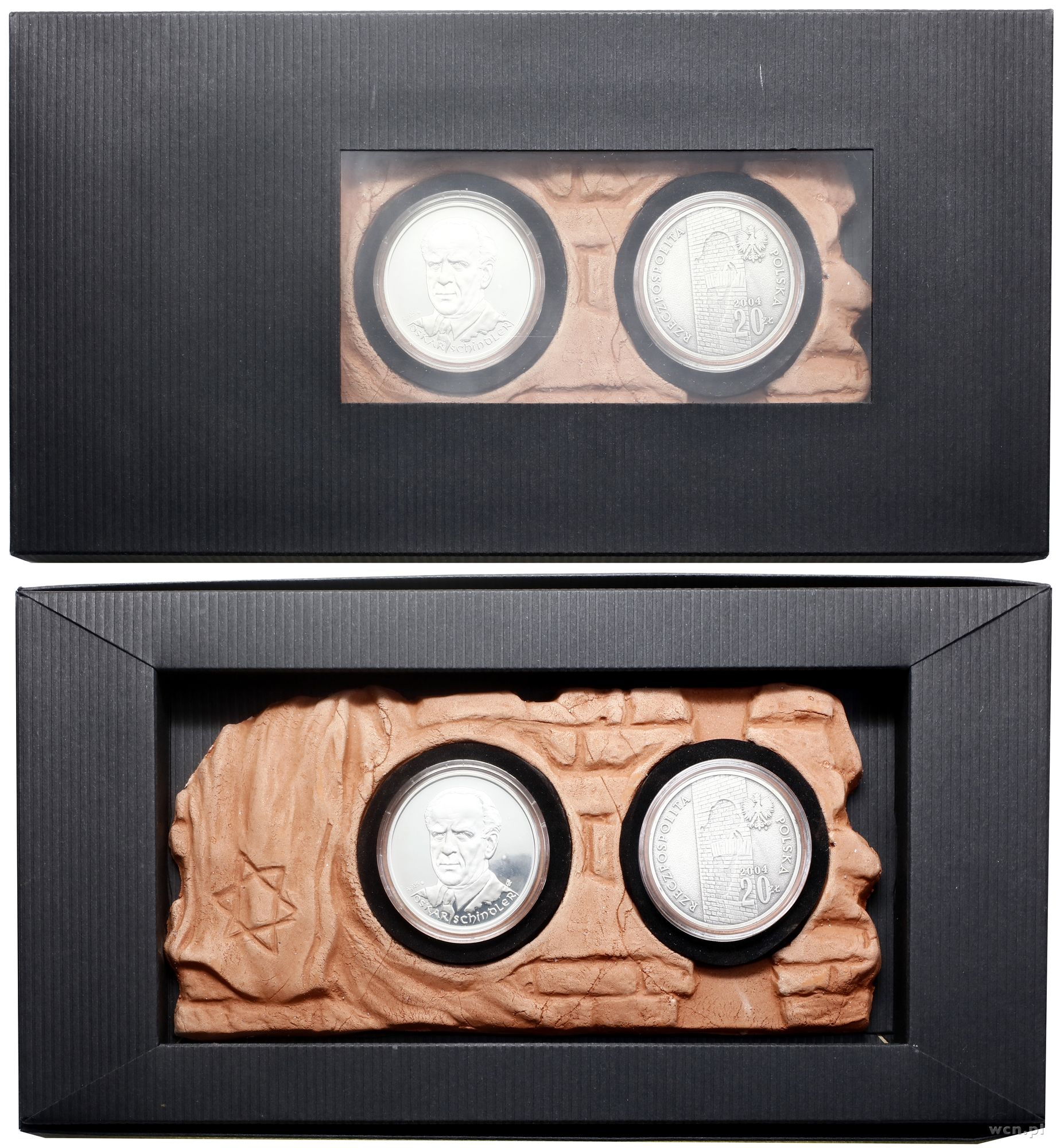 | Opis: | Polska, III Rzeczpospolita Polska (od 1989) - monety kolekcjonerskie, zestaw: 20 złotych 2004 i medal Oskar Schindler, zestaw poświęcony Gettu Łódzkiemu, srebro próby 925, 2 x ok. 28.28 g, egzemplarze w pamiątkowym pudełku z glinianą cegiełką z symbolem Gwiazdy Dawida |