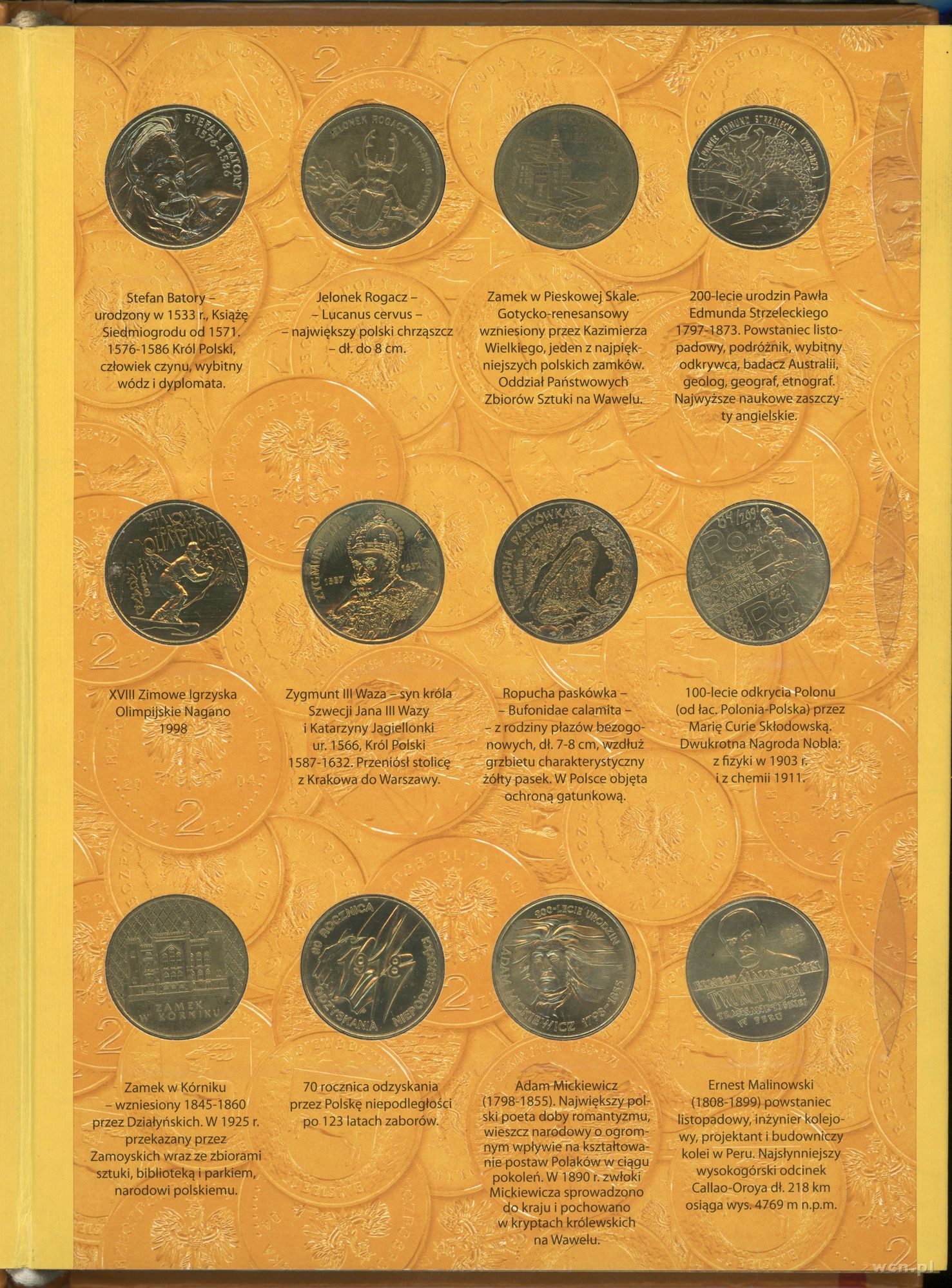 Opis: Polska, III Rzeczpospolita Polska (od 1989) - monety obiegowe, zestaw monet dwuzłotowych z lat 1995–2003, Warszawa, w klaserze 63 monety (oraz 7 dubletów, czyli łącznie 70 monet) z lat 1995–2003, w tym tych najrzadziej spotykanych jak 2 złote z Zygmuntem II Augustem, łącznie 70 sztuk w eleganckim albumie, monety w pięknych stanach zachowania, Parchimowicz 709–884