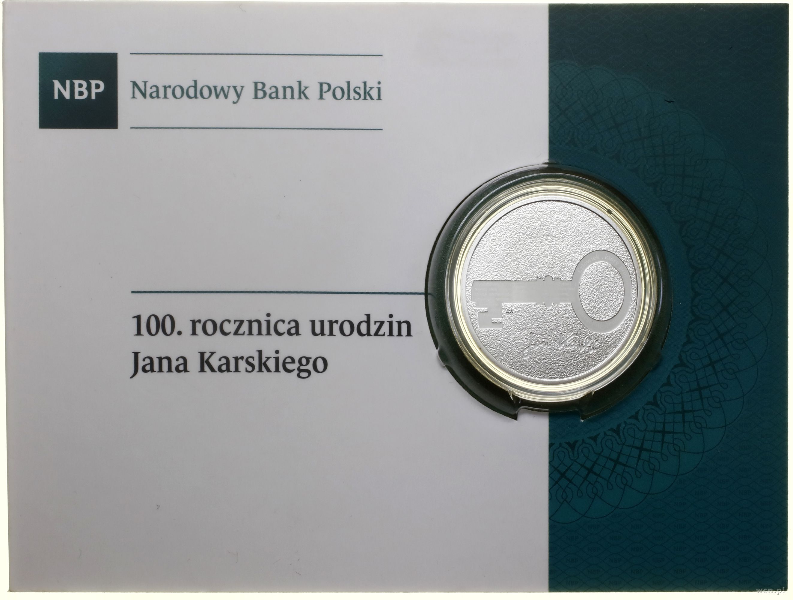 Opis: Polska, III Rzeczpospolita Polska (od 1989) - monety kolekcjonerskie, 10 złotych 2014, Warszawa, 100. rocznica urodzin Jana Karskiego, srebro próby 925, ok. 14.14 g, nakład do 30.000 sztuk, stemple lustrzane, moneta w plastikowym kapslu i oryginalnym opakowaniu z certyfikatem NBP, Parchimowicz 1314
