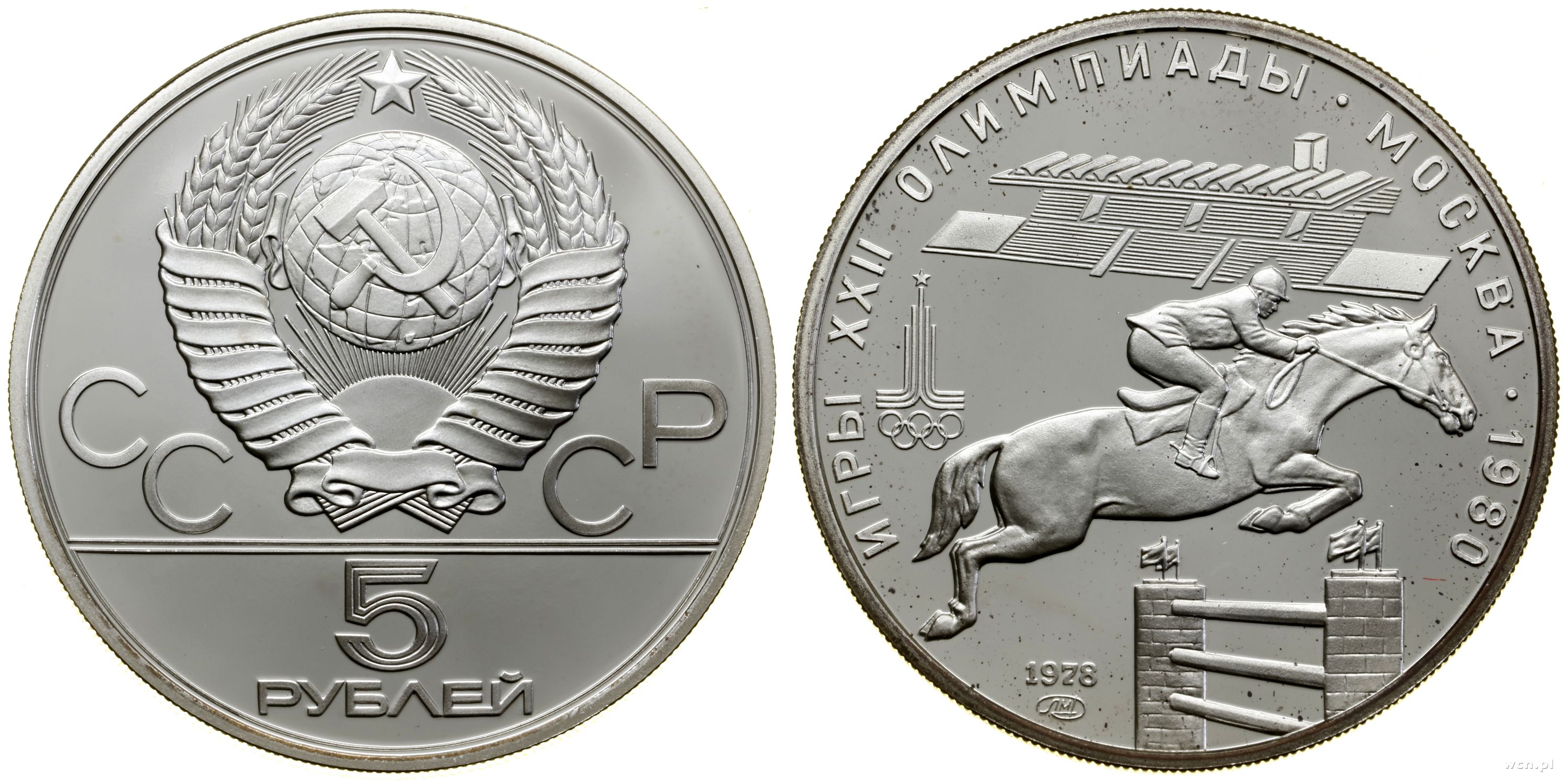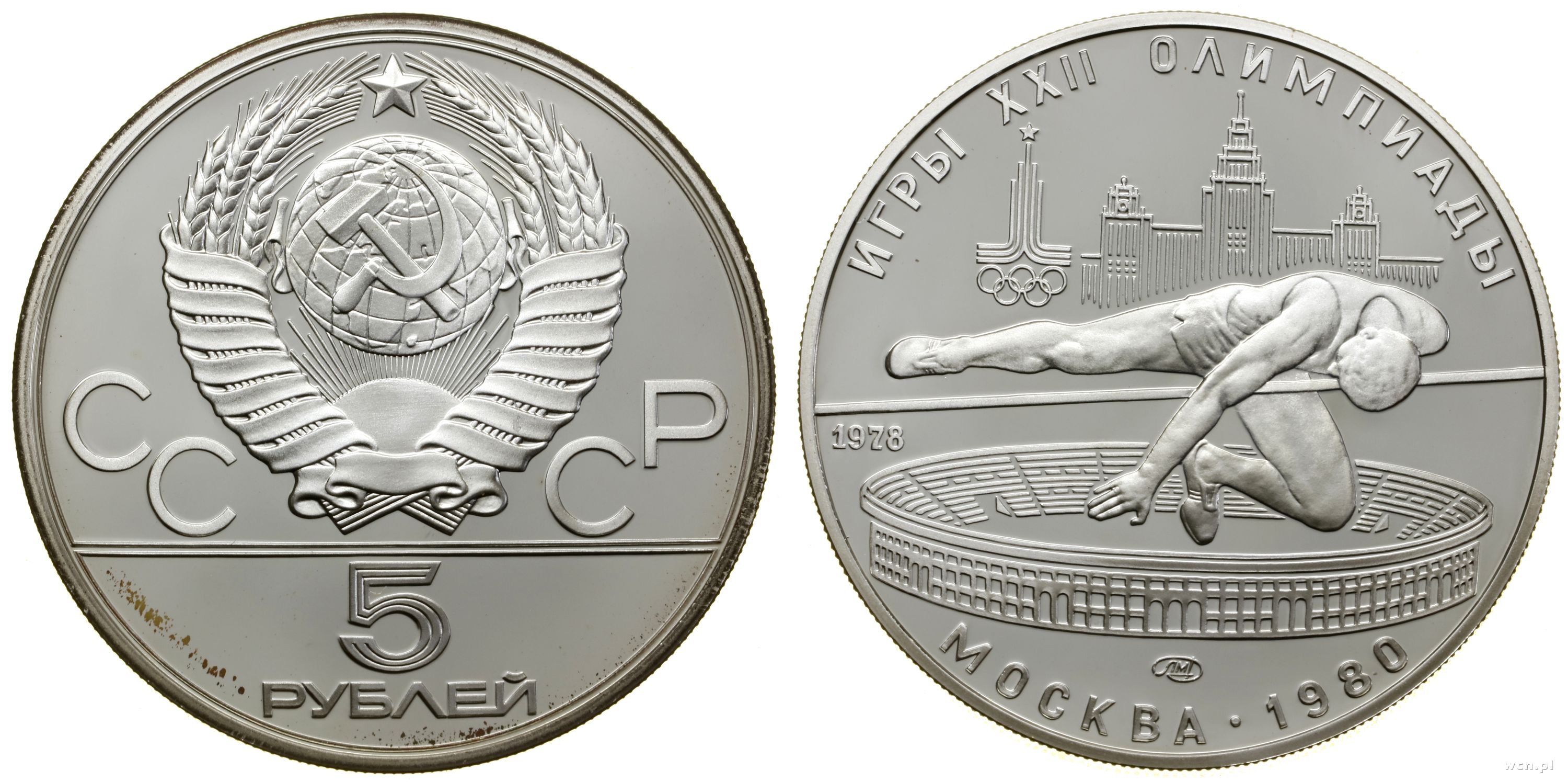 Opis: Rosja, ZSRS (1922–1991), zestaw 3 monet z okazji Igrzysk Olimpijskich w Moskwie 1978, Leningrad, w zestawie: 2 x 5 rubli (skok wzwyż i skok prze przeszkody) i 1 x 10 rubli (skok o tyczce), srebro próby 900, razem ok. 66.6 g, w czerwonym , lekko uszkodzonym pudełku, zestaw z certyfikatem, Parchimowicz 219c, Parchimowicz 220c, Parchimowicz 233c