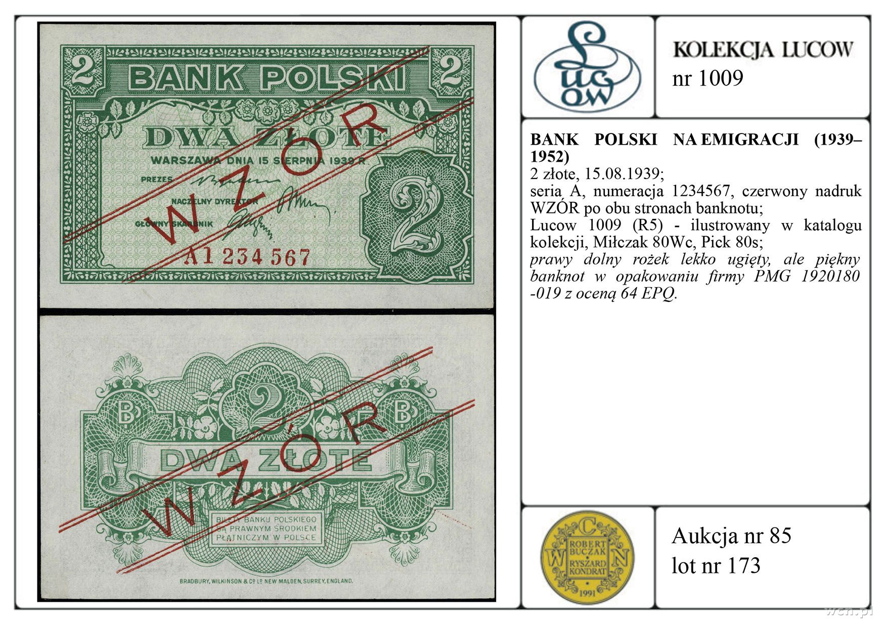 | Opis: | Polska, Bank Polski na emigracji (1939–1952), 2 złote 15.08.1939, seria A, numeracja 1234567, czerwony nadruk WZÓR po obu stronach banknotu, prawy dolny rożek lekko ugięty, piękny banknot z kolekcji Lucow , w opakowaniu firmy PMG nr 1920180-019 z oceną 64 Choice UNC EPQ, Lucow 1009 (R5) - ilustrowany w katalogu kolekcji, Miłczak 80Wc, Pick 80s |