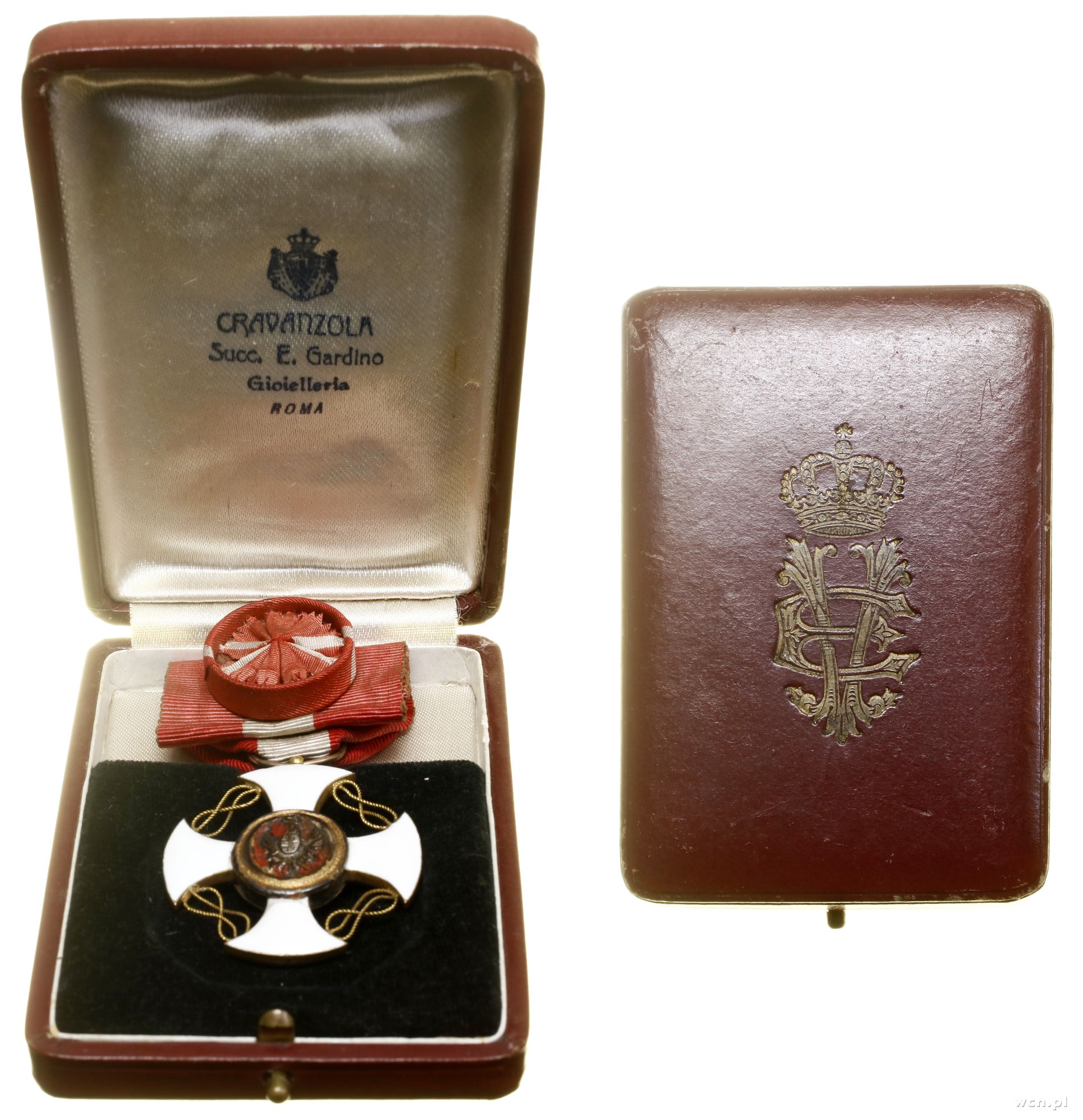 | Opis: | Włochy, Order Korony Włoch – Krzyż Oficerski, Rzym, Krzyż Ruperta, w kątach tzw. sabaudzkie węzły miłości, w medalionie korona, na stronie odwrotnej w medalionie orzeł z tarczą z krzyżem na piersi, odznaczenie , brąz, emalia, 36.1 x 39.2 mm, 14.97 g (ze wstążką), dodatkowo oryginalne pudełko |