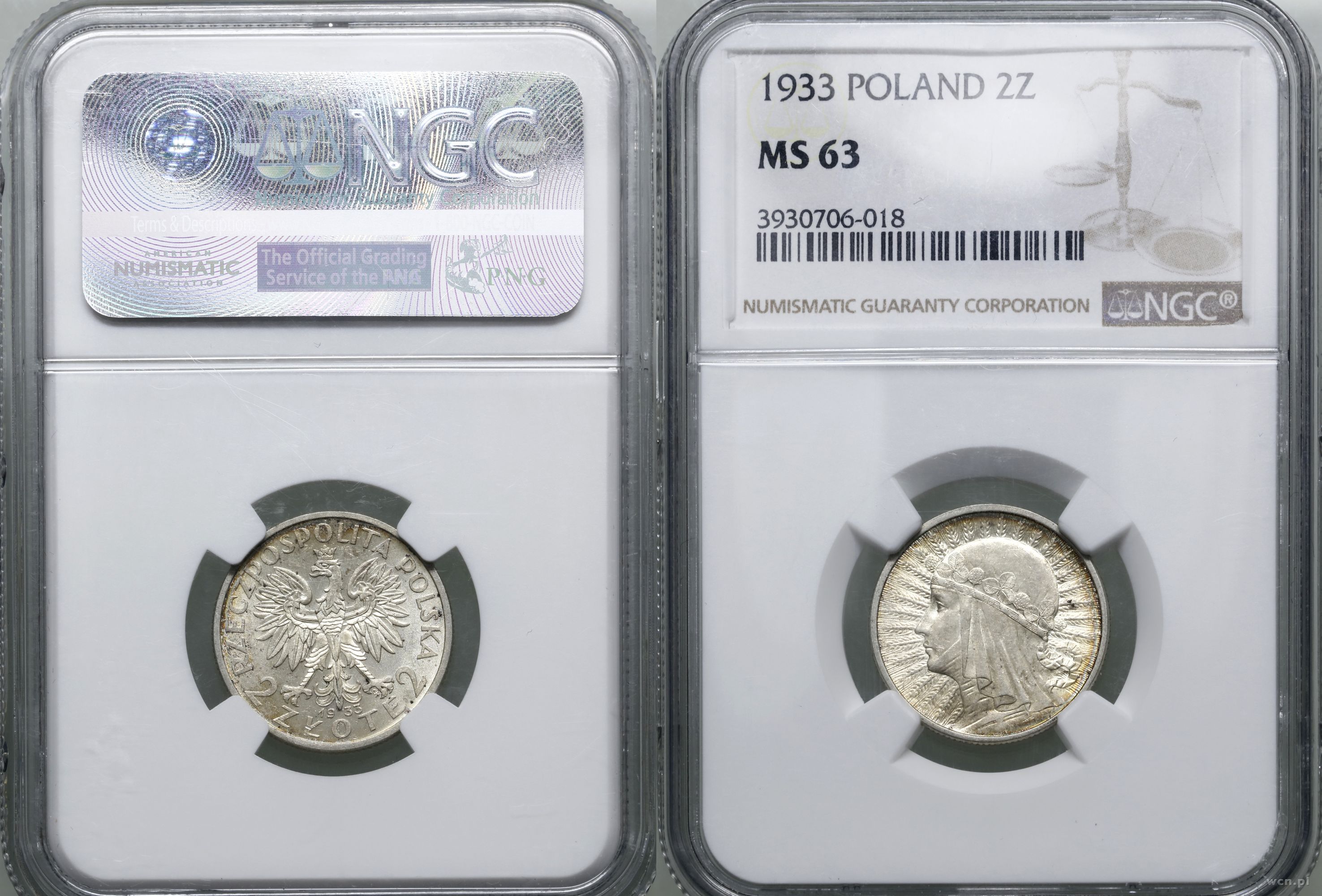 | Opis: | Polska, II Rzeczpospolita Polska (1918–1939), 2 złote 1933, Warszawa, głowa kobiety w czepcu, piękne , w opakowaniu firmy NGC nr 3930706-018 z oceną MS63, Parchimowicz 110b |