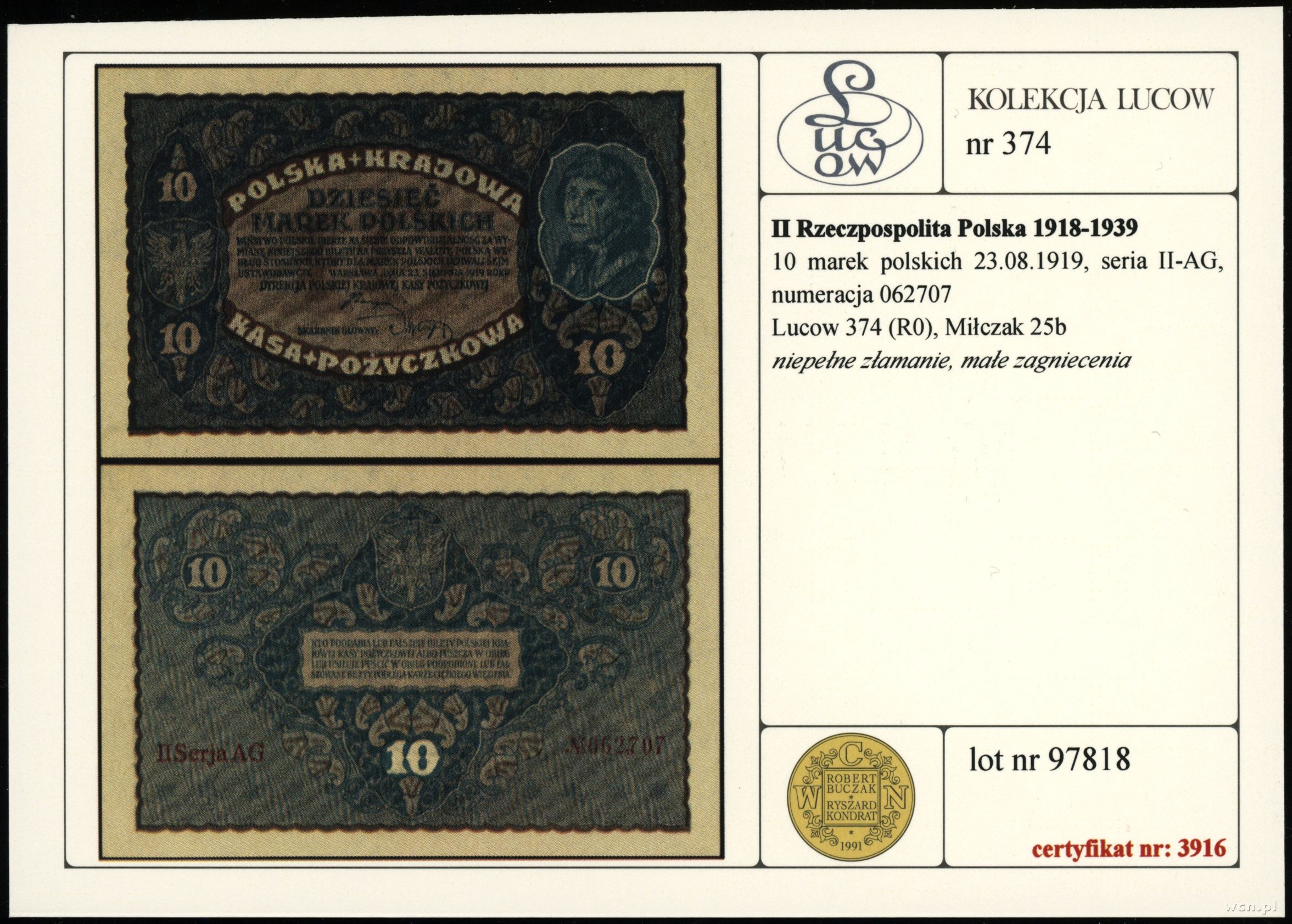 | Opis: | Polska, II Rzeczpospolita Polska (1918–1939) - emisje przed reformą Władysława Grabskiego, 10 marek polskich 23.08.1919, seria II-AG, numeracja 062707, niepełne złamanie, małe zagniecenia, banknot z kolekcji Lucow, Lucow 374 (R0), Miłczak 25b |